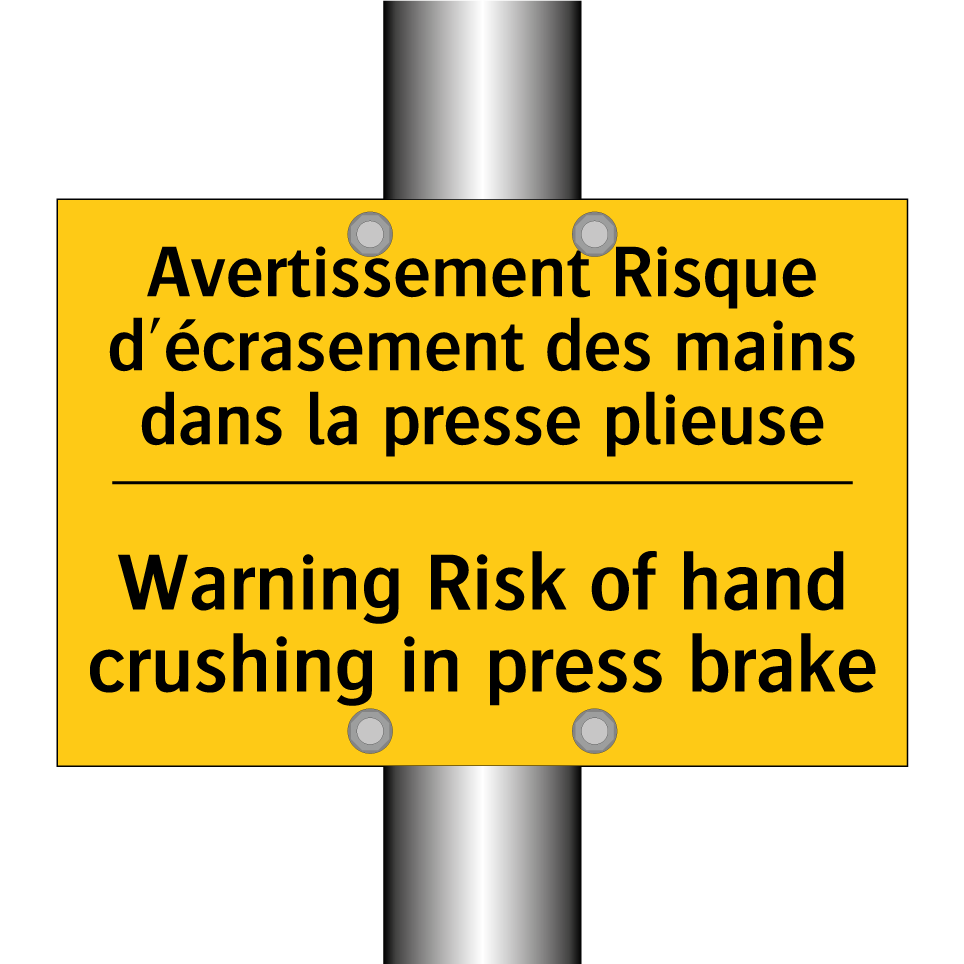 Panneau d'avertissement bilingue avec texte en français : "Avertissement Risque d'écrasement des mains dans la presse plieuse", et en anglais : "Warning Risk of hand crushing in press brake"