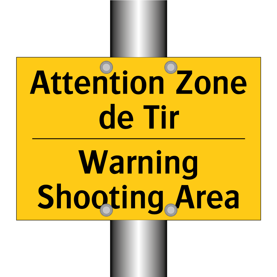 Panneau d'avertissement bilingue avec texte en français : "Attention Zone de Tir", et en anglais : "Warning Shooting Area"