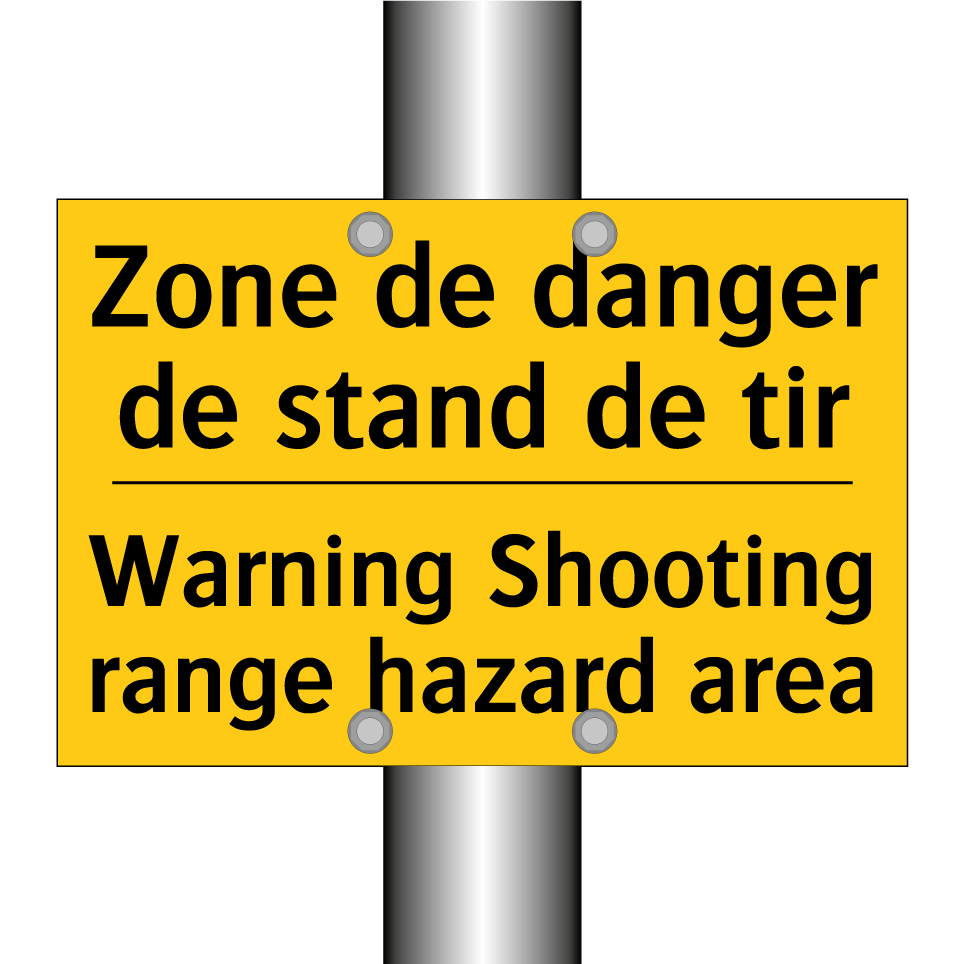 Panneau d'avertissement bilingue avec texte en français : "Zone de danger de stand de tir", et en anglais : "Warning Shooting range hazard area"