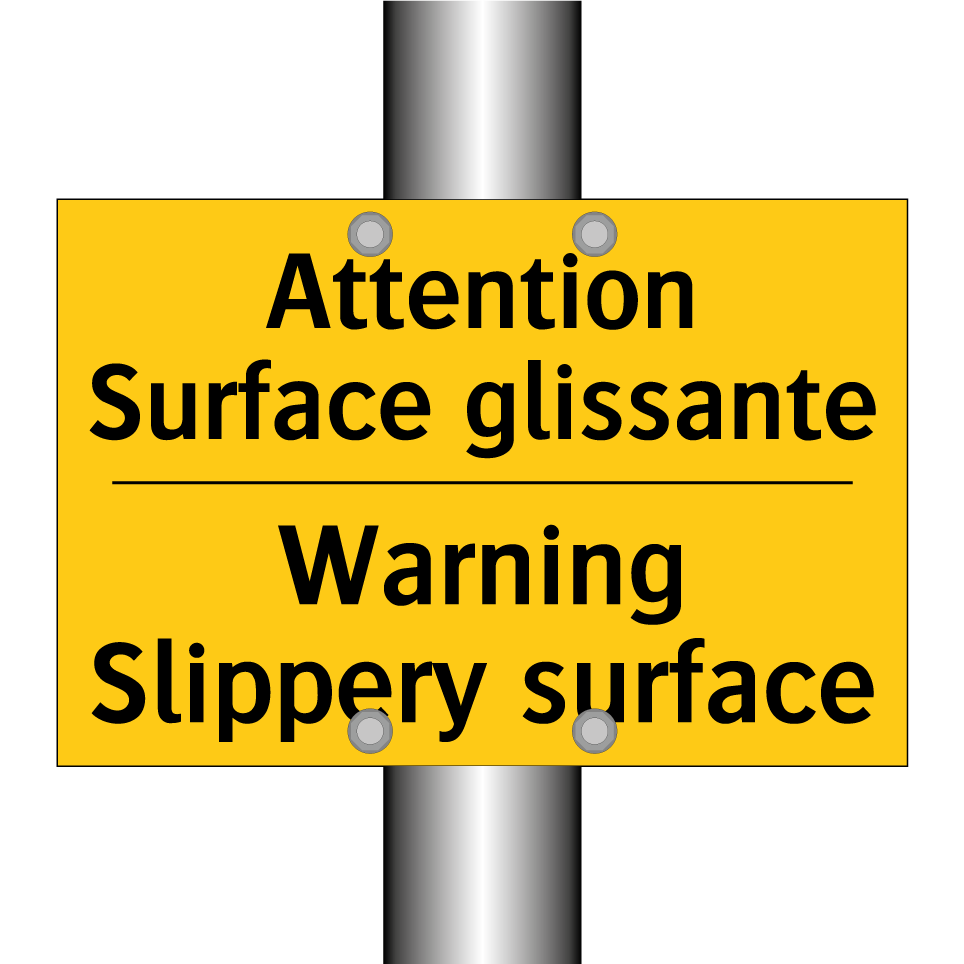 Panneau d'avertissement bilingue avec texte en français : "Attention Surface glissante", et en anglais : "Warning Slippery surface"