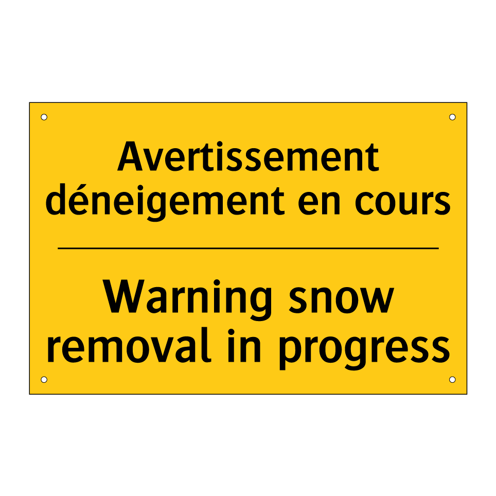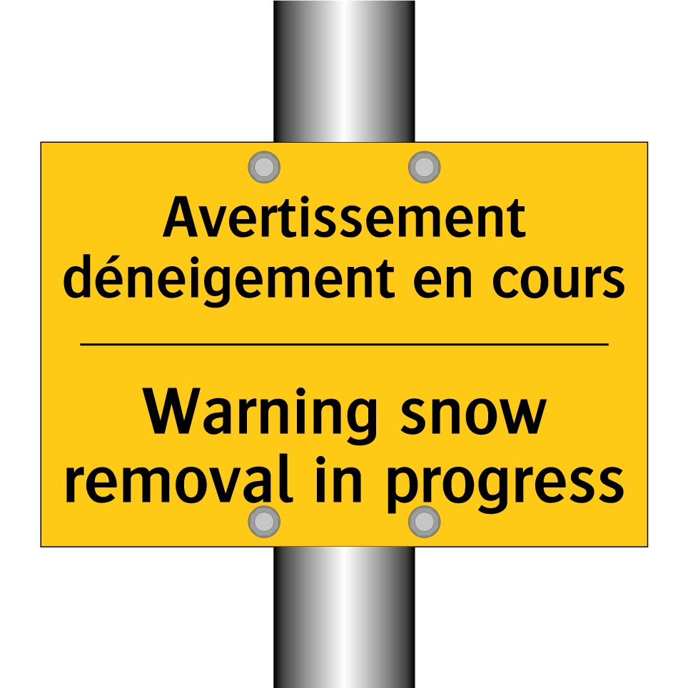 Panneau d'avertissement bilingue avec texte en français : "Avertissement déneigement en cours", et en anglais : "Warning snow removal in progress"