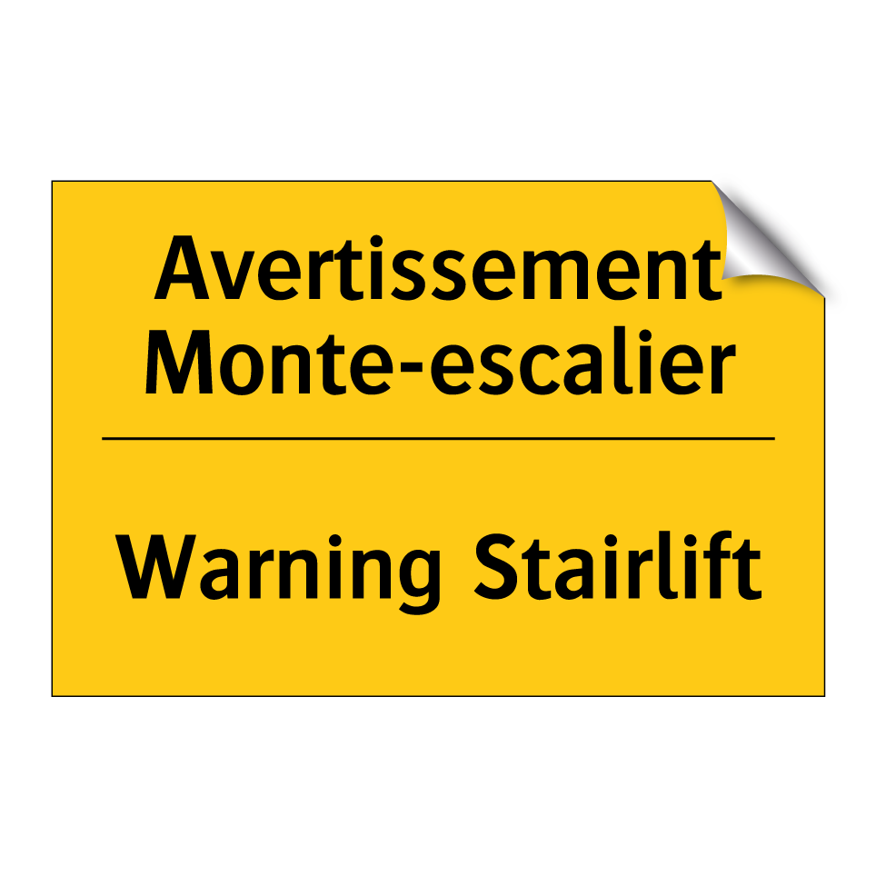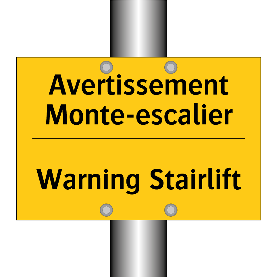 Panneau d'avertissement bilingue avec texte en français : "Avertissement Monte-escalier", et en anglais : "Warning Stairlift"