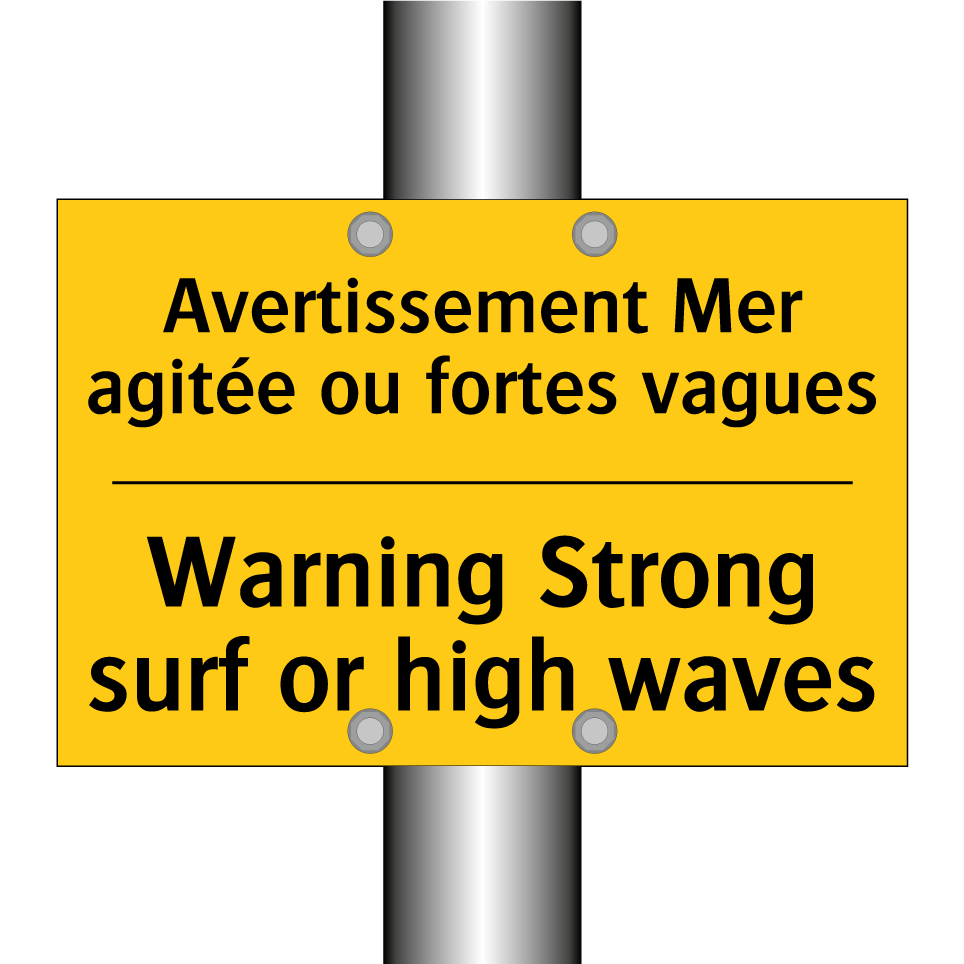 Panneau d'avertissement bilingue avec texte en français : "Avertissement Mer agitée ou fortes vagues", et en anglais : "Warning Strong surf or high waves"