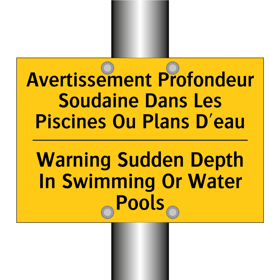 Panneau d'avertissement bilingue avec texte en français : "Avertissement Profondeur Soudaine Dans Les Piscines Ou Plans D'eau", et en anglais : "Warning Sudden Depth In Swimming Or Water Pools"