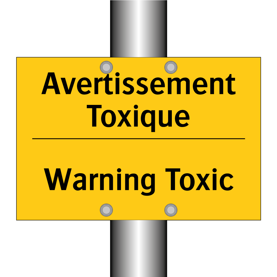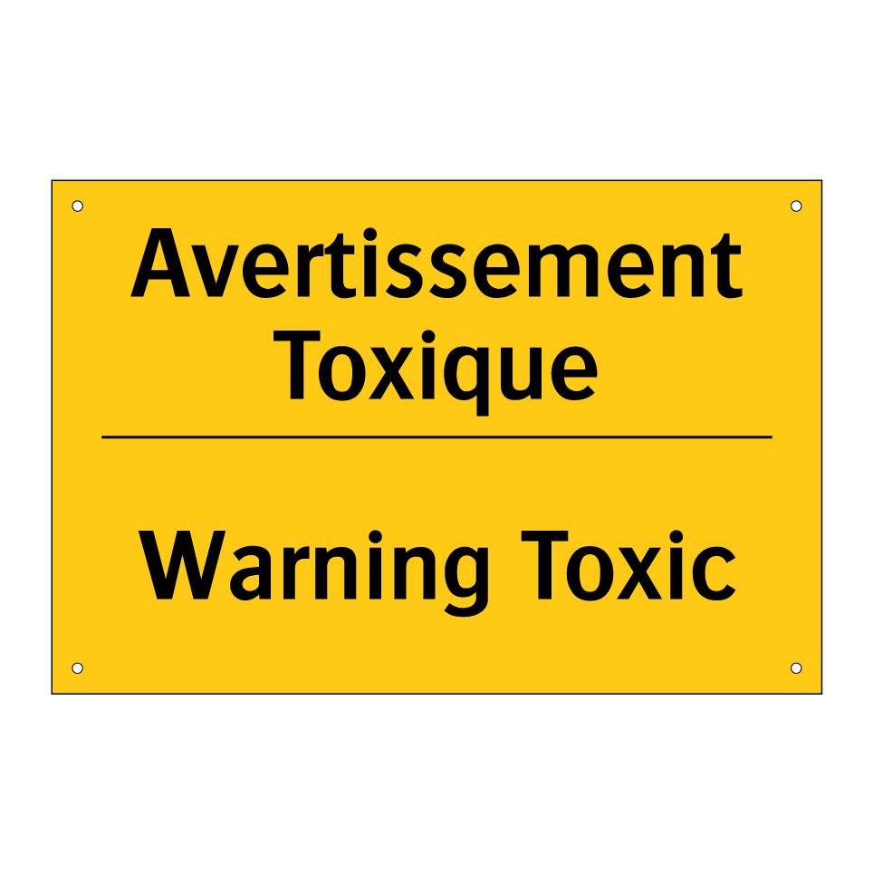 Panneau d'avertissement bilingue avec texte en français : "Avertissement Toxique", et en anglais : "Warning Toxic"