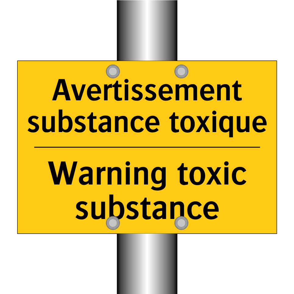 Panneau d'avertissement bilingue avec texte en français : "Avertissement substance toxique", et en anglais : "Warning toxic substance"