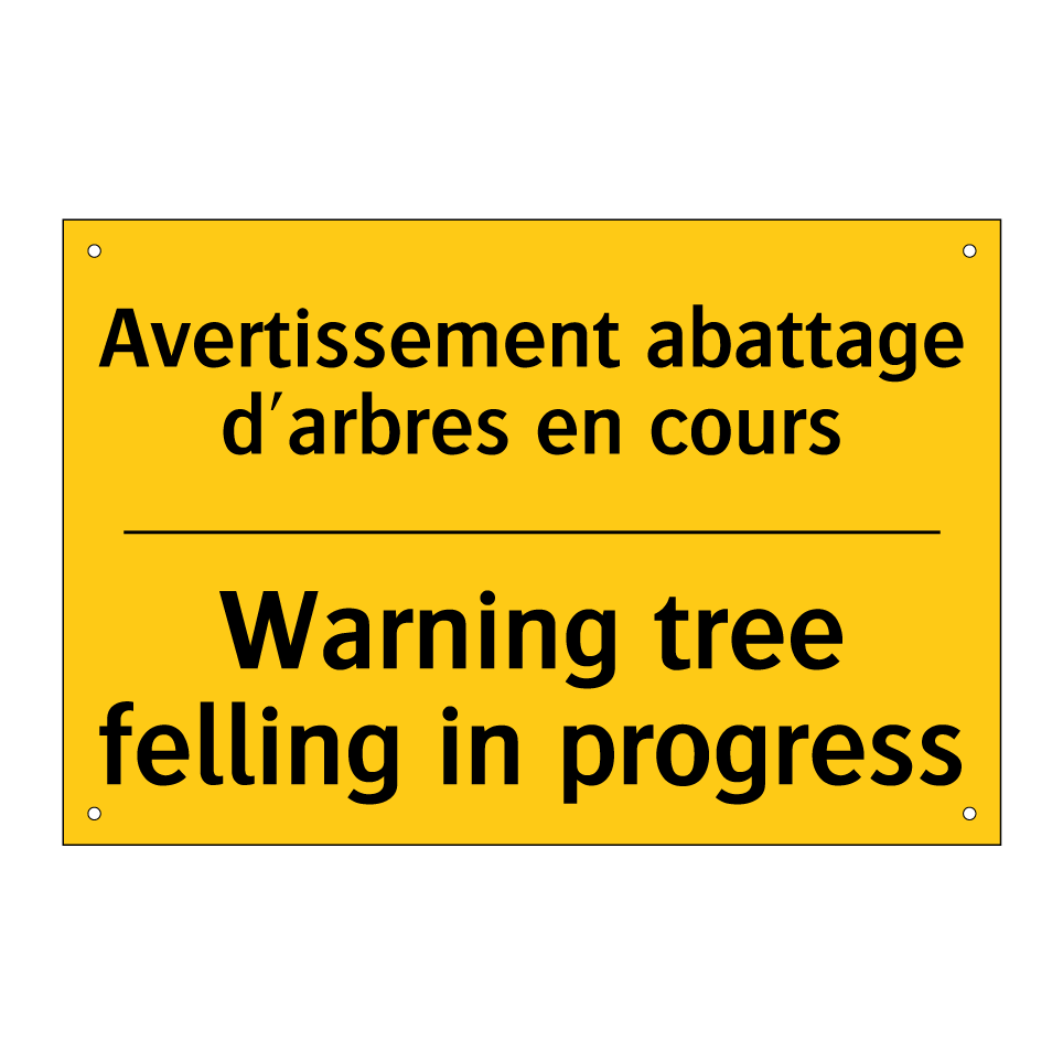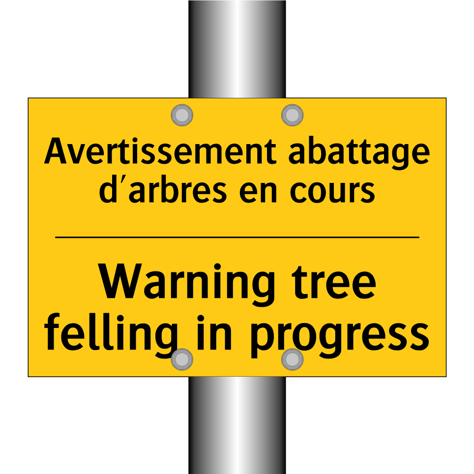 Panneau d'avertissement bilingue avec texte en français : "Avertissement abattage d'arbres en cours", et en anglais : "Warning tree felling in progress"