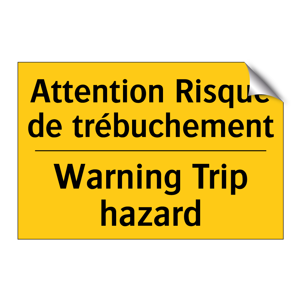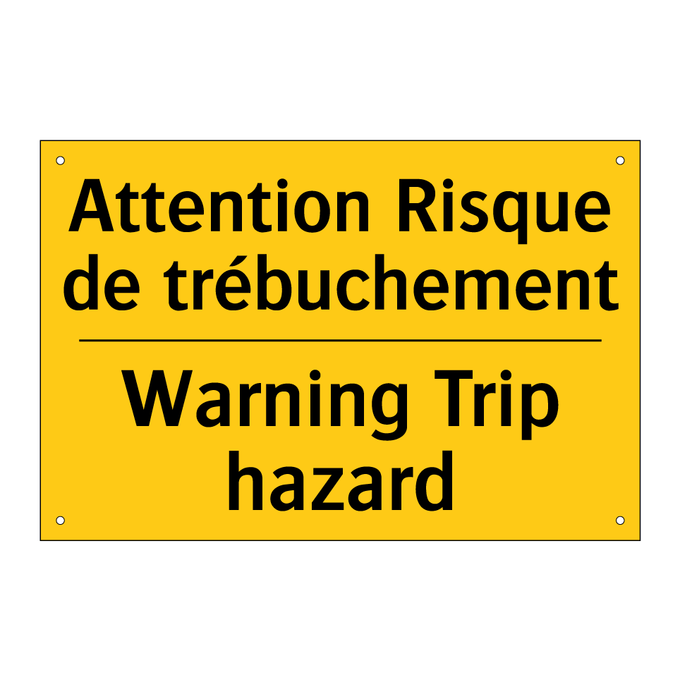 Panneau d'avertissement bilingue avec texte en français : "Attention Risque de trébuchement", et en anglais : "Warning Trip hazard"