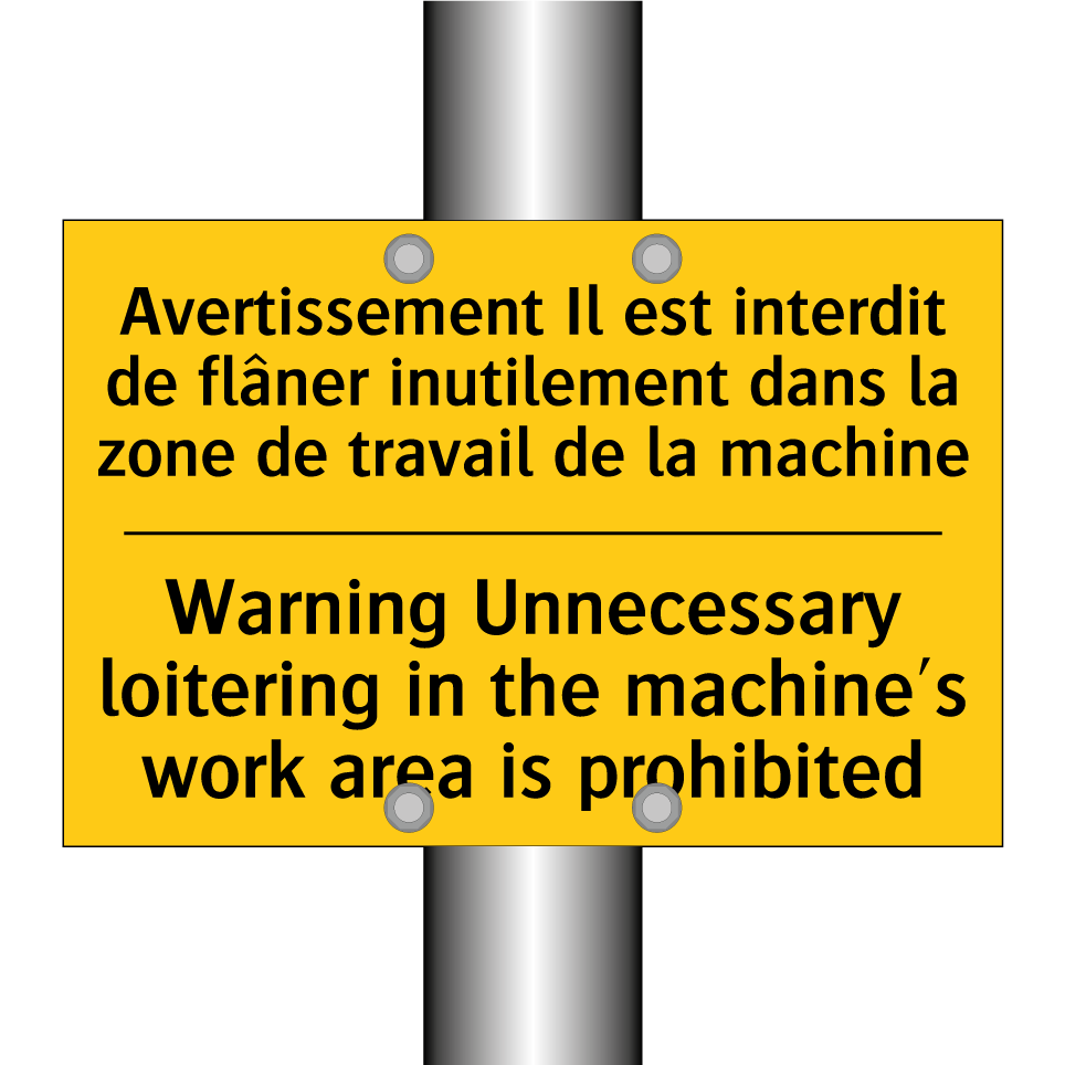 Panneau d'avertissement bilingue avec texte en français : "Avertissement Il est interdit de flâner inutilement dans la zone de travail de la machine", et en anglais : "Warning Unnecessary loitering in the machine's work area is prohibited"