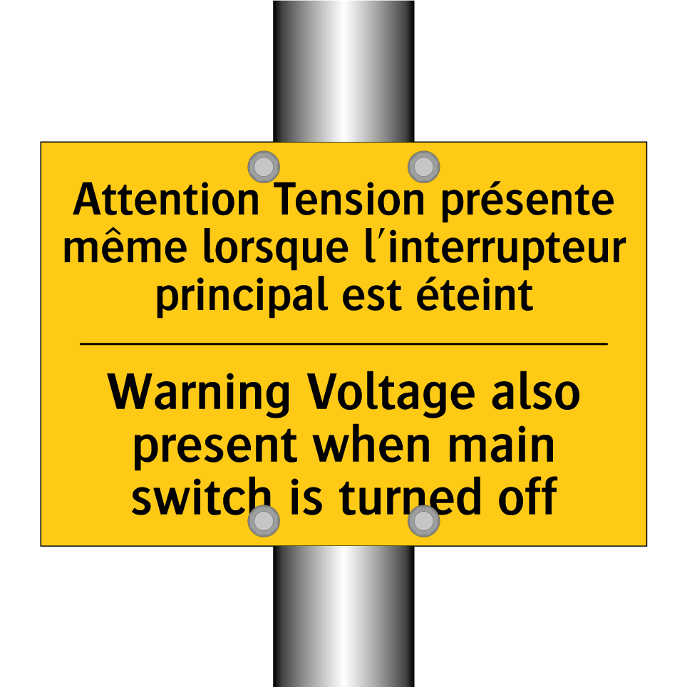 Panneau d'avertissement bilingue avec texte en français : "Attention Tension présente même lorsque l'interrupteur principal est éteint", et en anglais : "Warning Voltage also present when main switch is turned off"