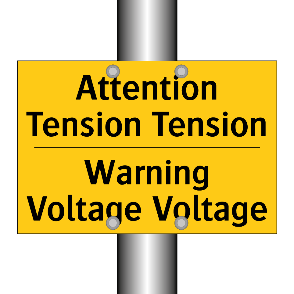Panneau d'avertissement bilingue avec texte en français : "Attention Tension Tension", et en anglais : "Warning Voltage Voltage"