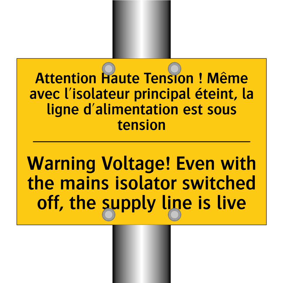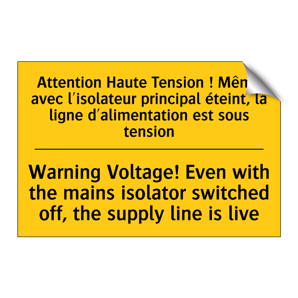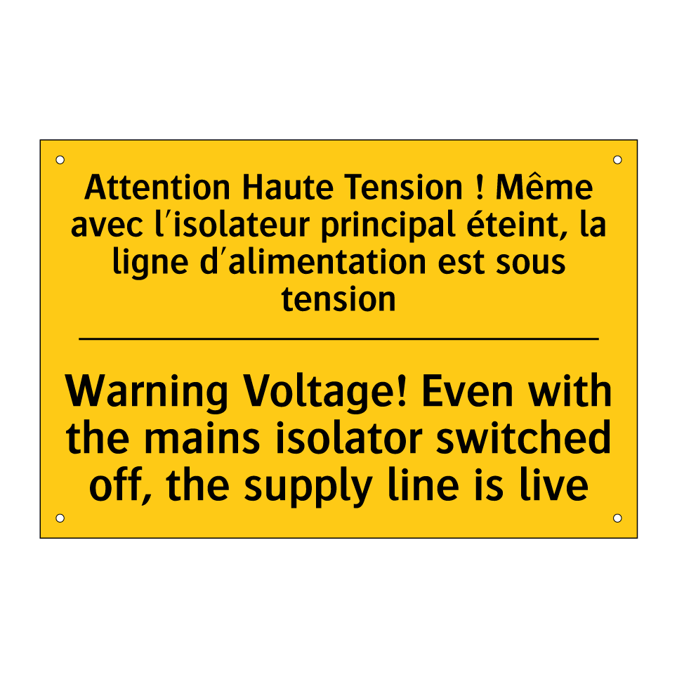 Panneau d'avertissement bilingue avec texte en français : "Attention Haute Tension ! Même avec l'isolateur principal éteint, la ligne d'alimentation est sous tension", et en anglais : "Warning Voltage! Even with the mains isolator switched off, the supply line is live"