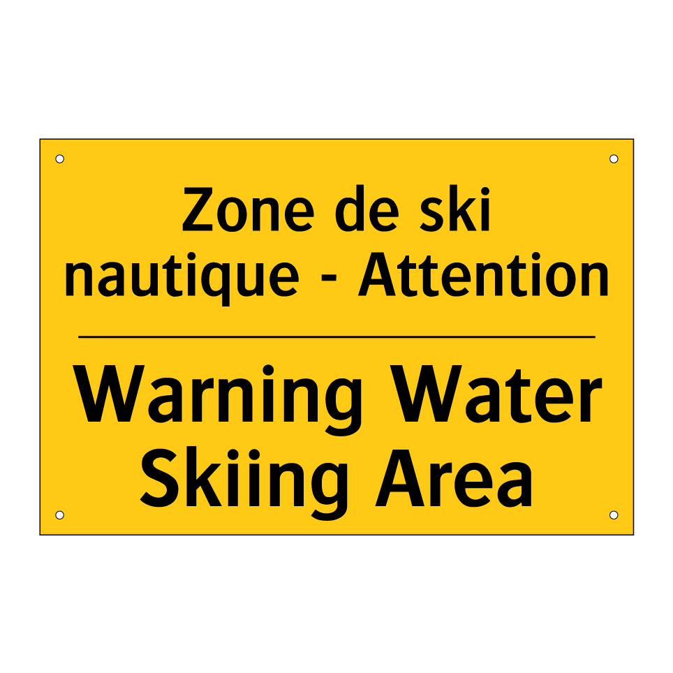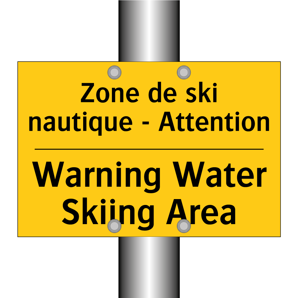 Panneau d'avertissement bilingue avec texte en français : "Zone de ski nautique - Attention", et en anglais : "Warning Water Skiing Area"