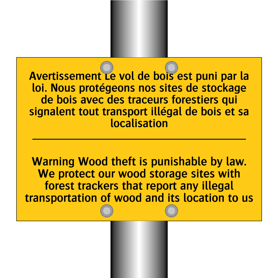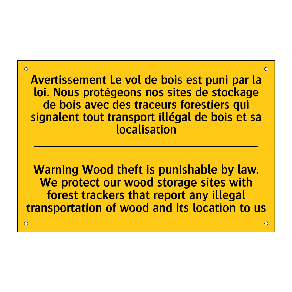 Panneau d'avertissement bilingue avec texte en français : "Avertissement Le vol de bois est puni par la loi. Nous protégeons nos sites de stockage de bois avec des traceurs forestiers qui signalent tout transport illégal de bois et sa localisation", et en anglais : "Warning Wood theft is punishable by law. We protect our wood storage sites with forest trackers that report any illegal transportation of wood and its location to us"