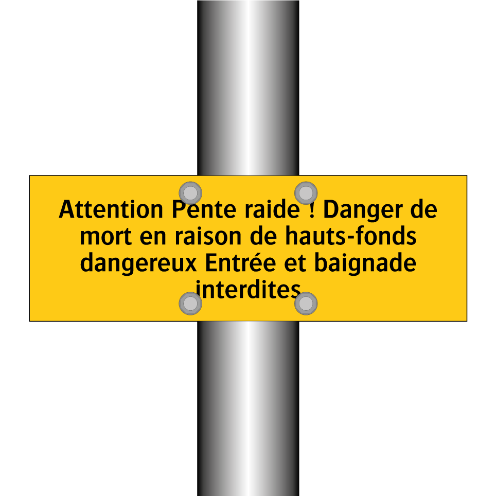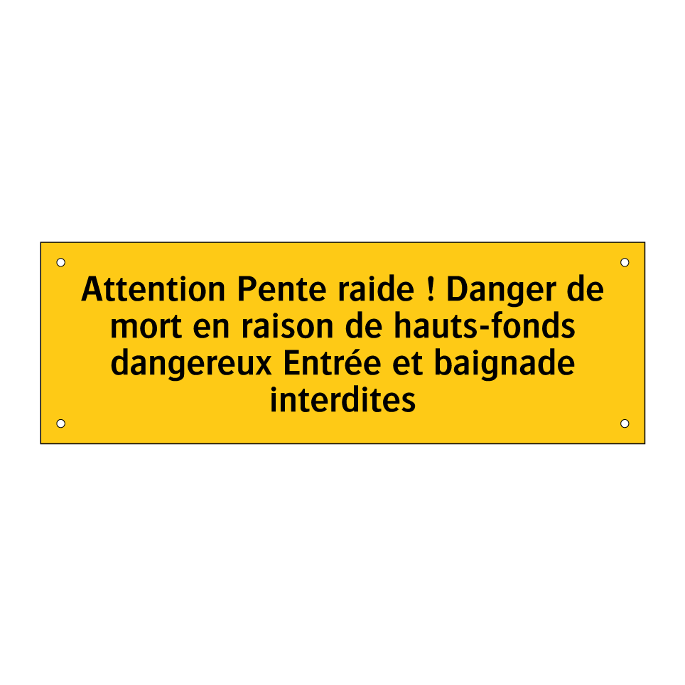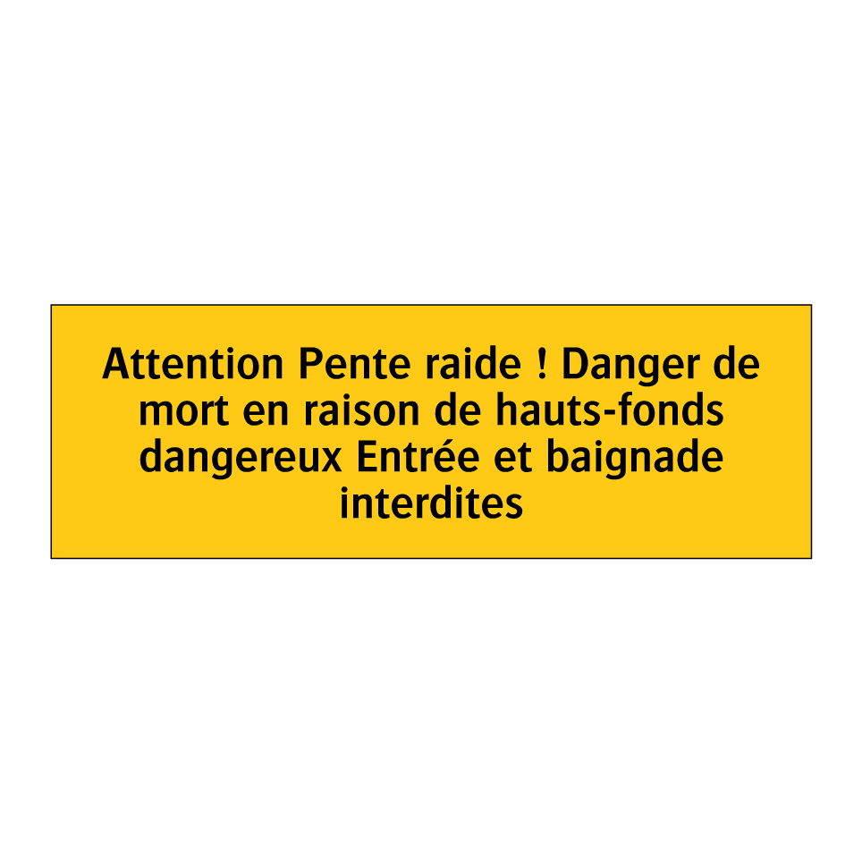 Panneau d'avertissement avec le texte : "Attention Pente raide ! Danger de mort en raison de hauts-fonds dangereux Entrée et baignade interdites"