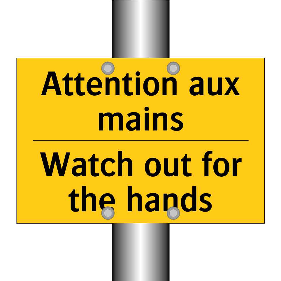 Panneau d'avertissement bilingue avec texte en français : "Attention aux mains", et en anglais : "Watch out for the hands"