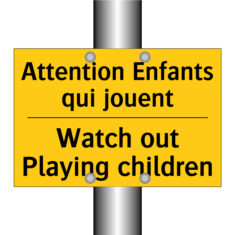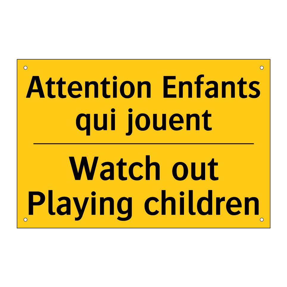 Panneau d'avertissement bilingue avec texte en français : "Attention Enfants qui jouent", et en anglais : "Watch out Playing children"