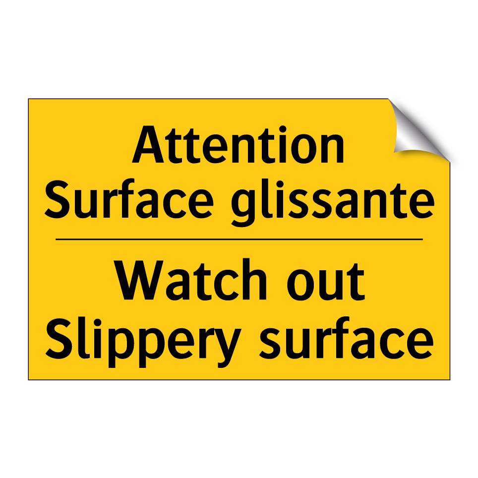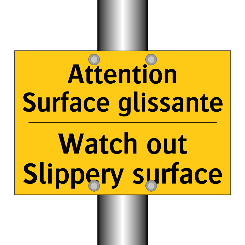 Panneau d'avertissement bilingue avec texte en français : "Attention Surface glissante", et en anglais : "Watch out Slippery surface"