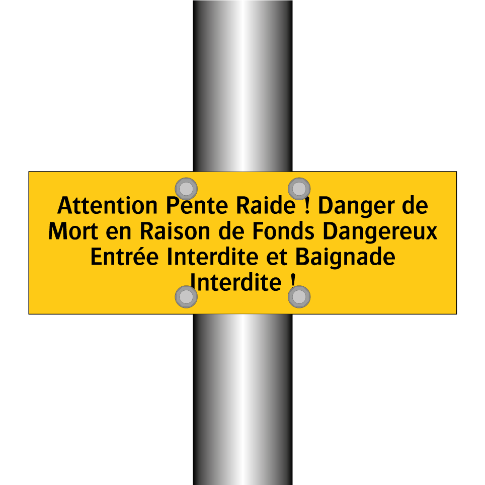 Panneau d'avertissement avec le texte : "Attention Pente Raide ! Danger de Mort en Raison de Fonds Dangereux Entrée Interdite et Baignade Interdite !"