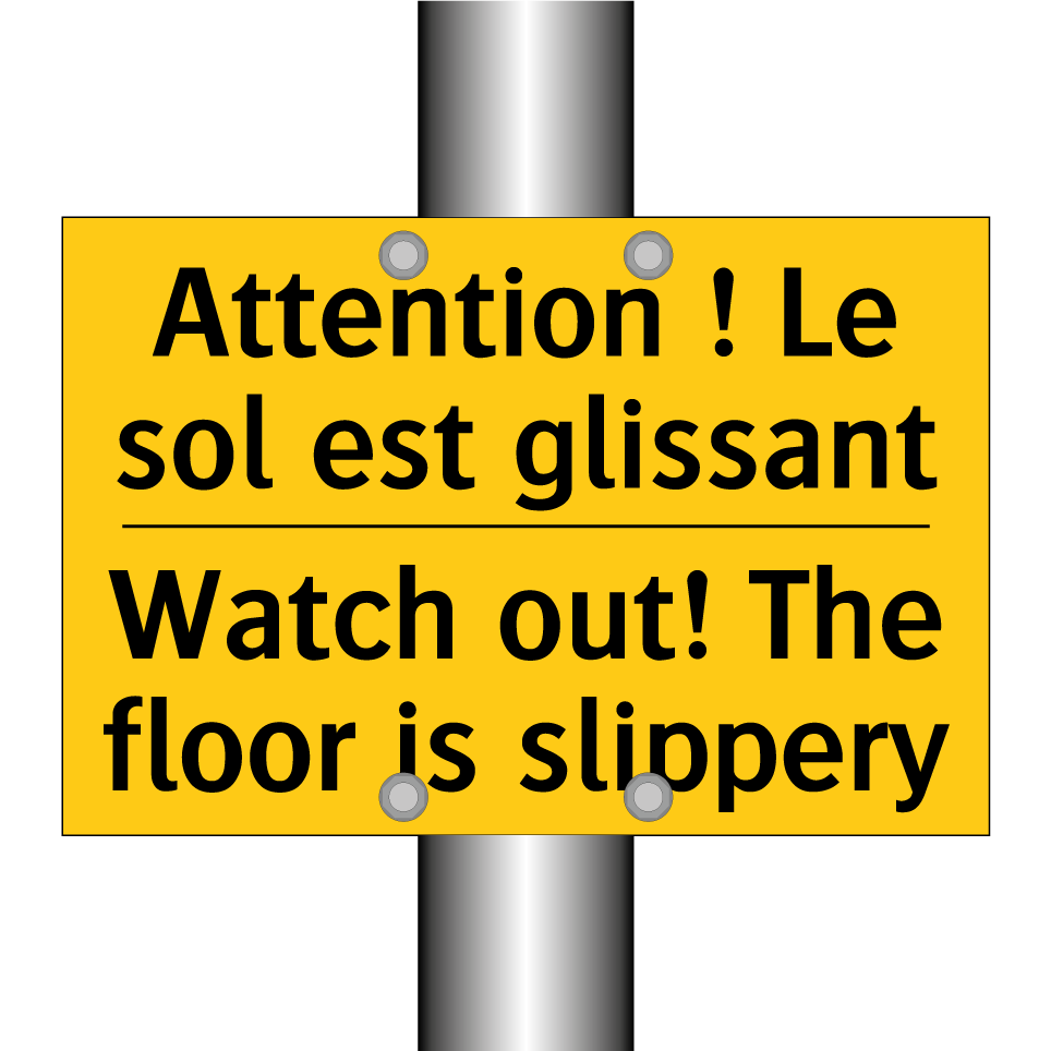 Panneau d'avertissement bilingue avec texte en français : "Attention ! Le sol est glissant", et en anglais : "Watch out! The floor is slippery"