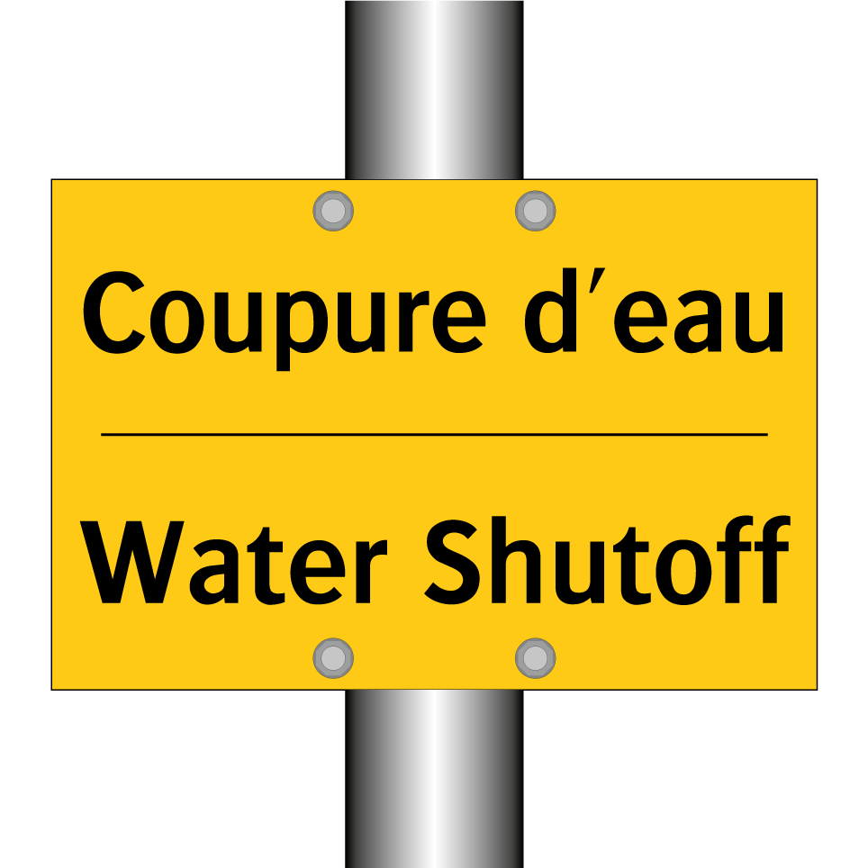 Panneau d'avertissement bilingue avec texte en français : "Coupure d'eau", et en anglais : "Water Shutoff"