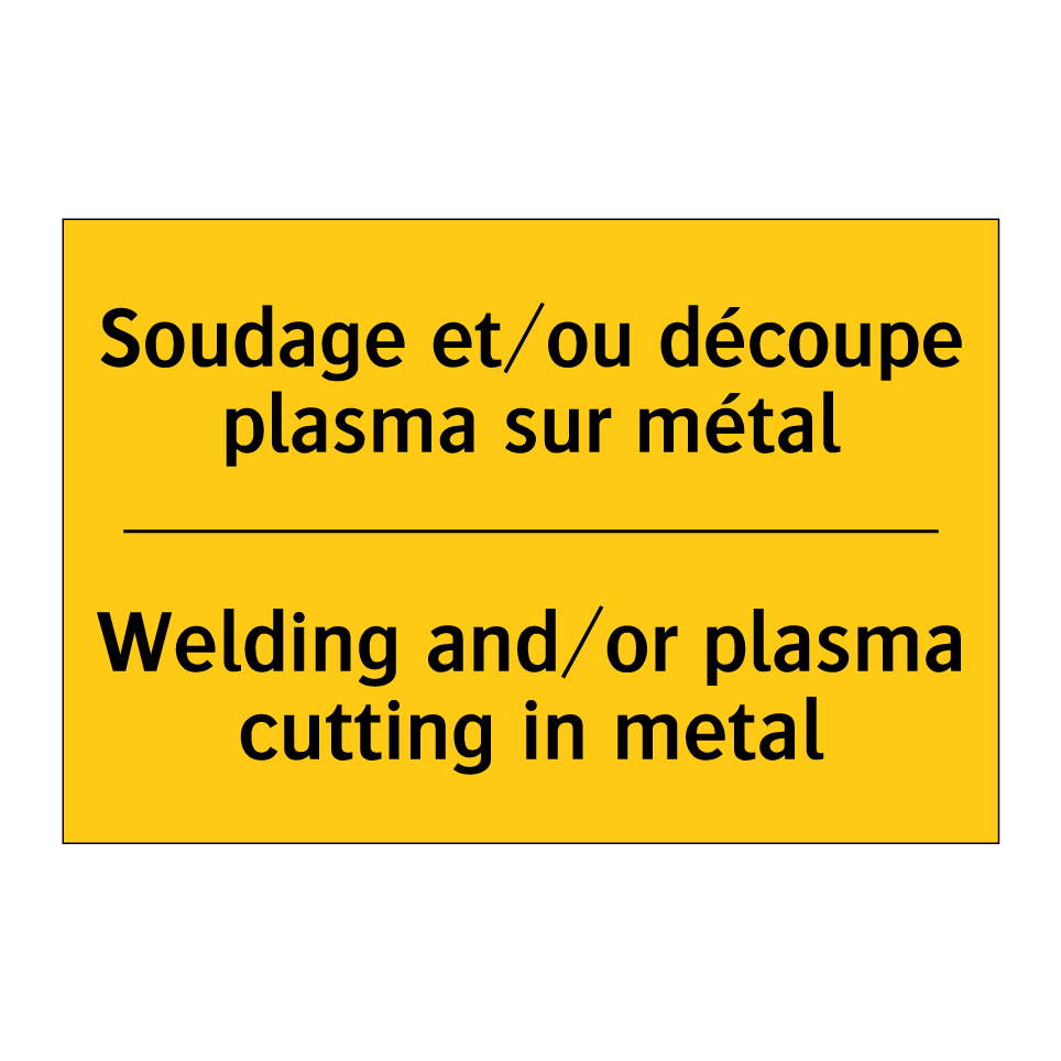 Panneau d'avertissement bilingue avec texte en français : "Soudage et/ou découpe plasma sur métal", et en anglais : "Welding and/or plasma cutting in metal"
