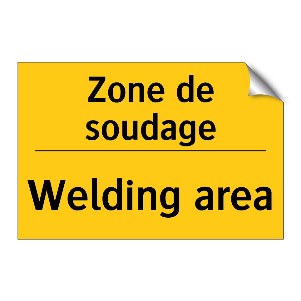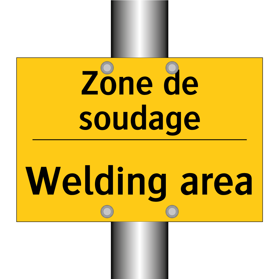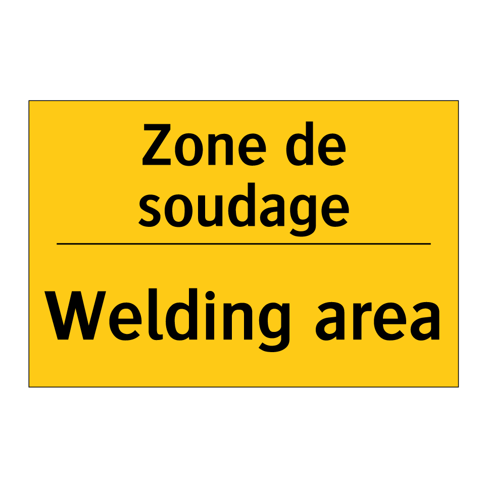 Panneau d'avertissement bilingue avec texte en français : "Zone de soudage", et en anglais : "Welding area"