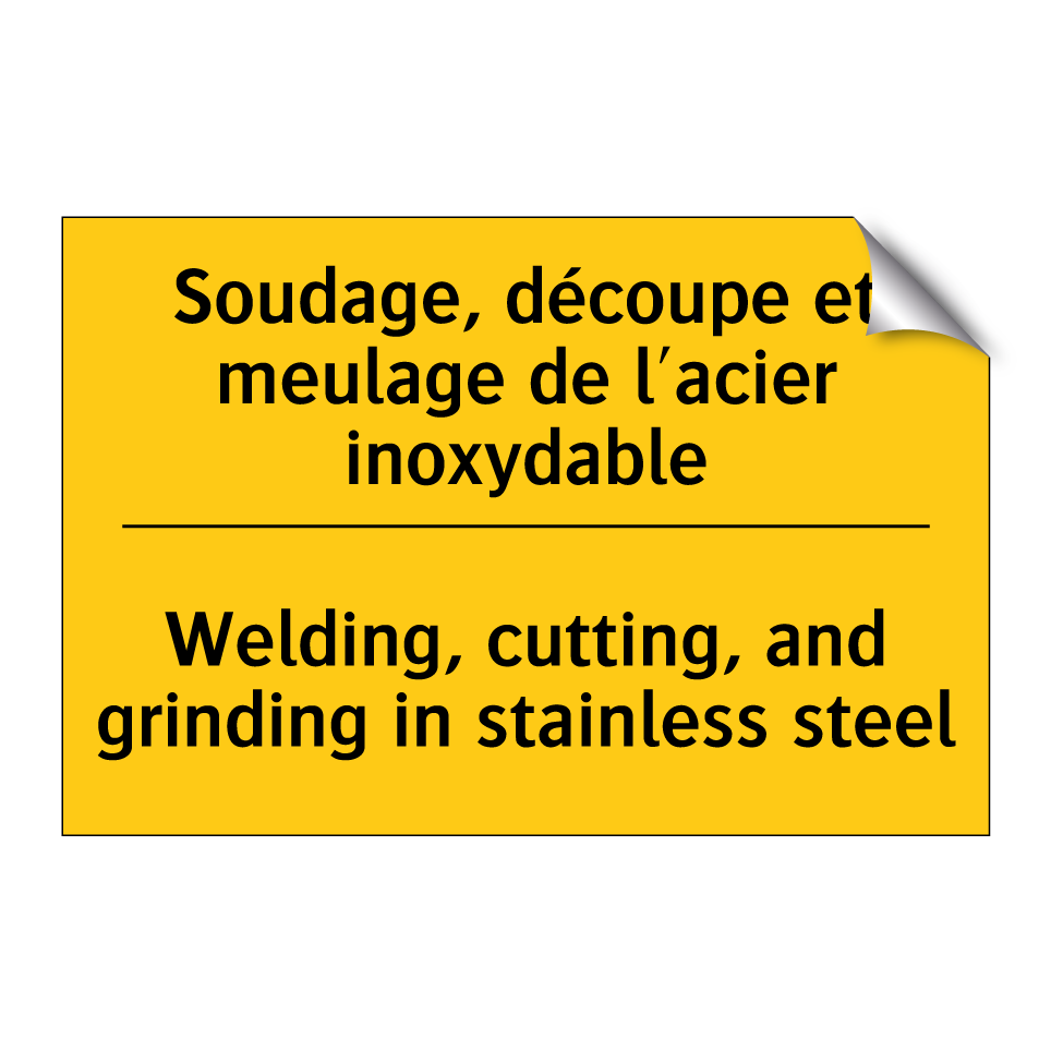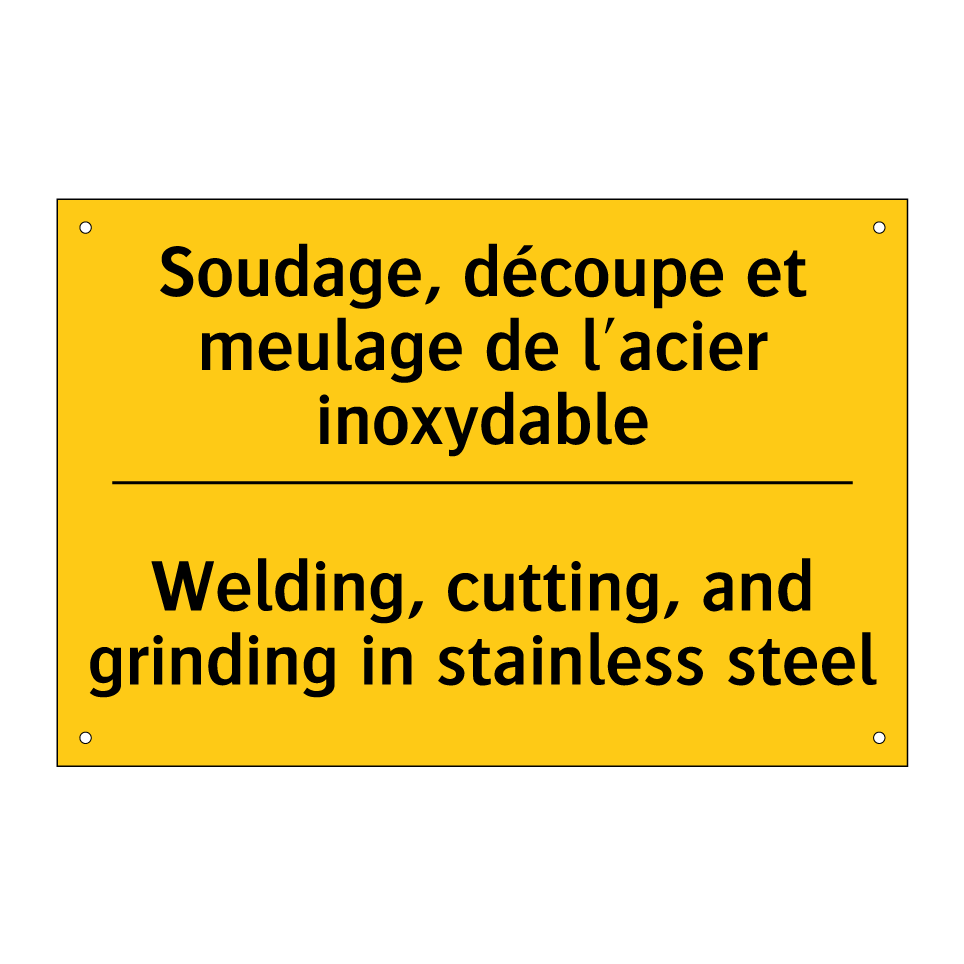 Panneau d'avertissement bilingue avec texte en français : "Soudage, découpe et meulage de l'acier inoxydable", et en anglais : "Welding, cutting, and grinding in stainless steel"