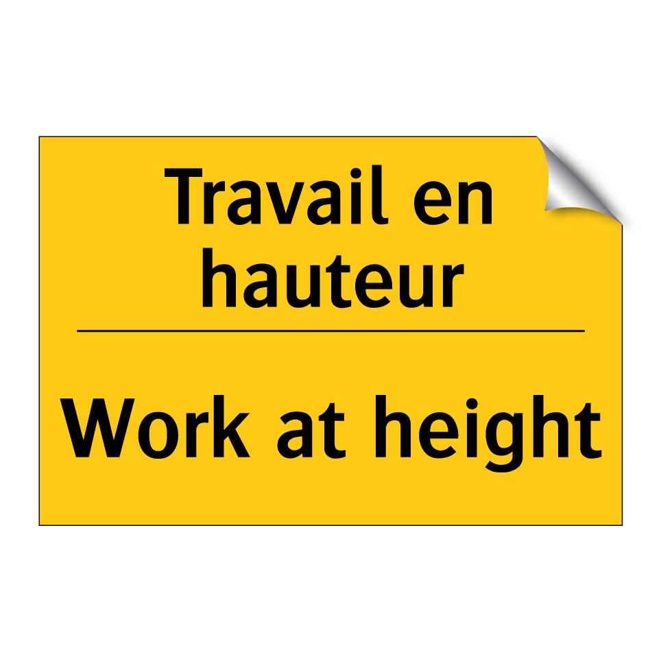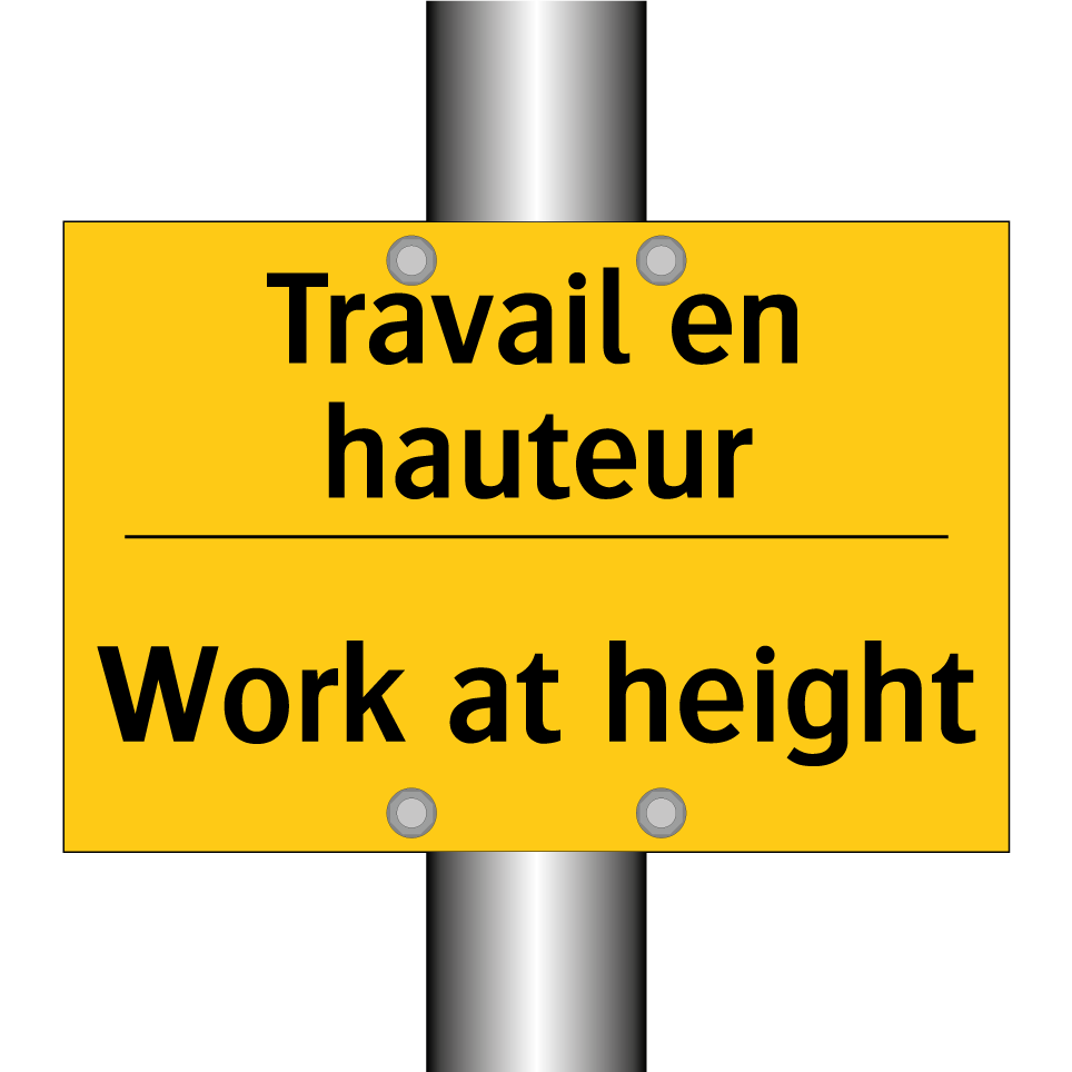 Panneau d'avertissement bilingue avec texte en français : "Travail en hauteur", et en anglais : "Work at height"