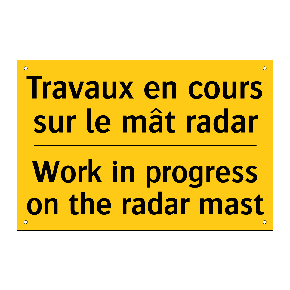 Panneau d'avertissement bilingue avec texte en français : "Travaux en cours sur le mât radar", et en anglais : "Work in progress on the radar mast"