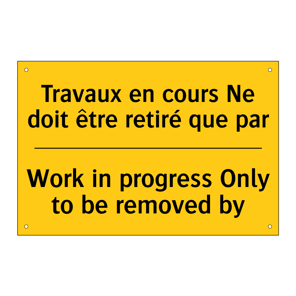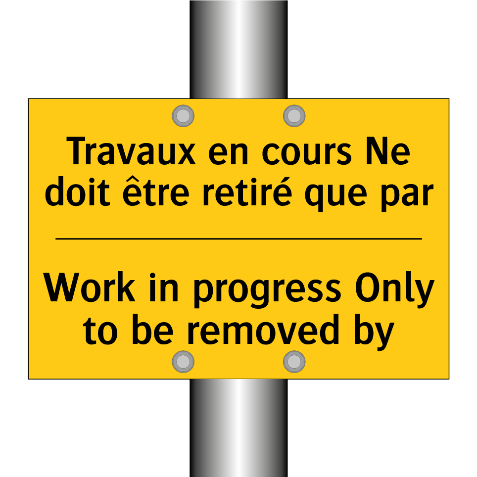 Panneau d'avertissement bilingue avec texte en français : "Travaux en cours Ne doit être retiré que par", et en anglais : "Work in progress Only to be removed by"