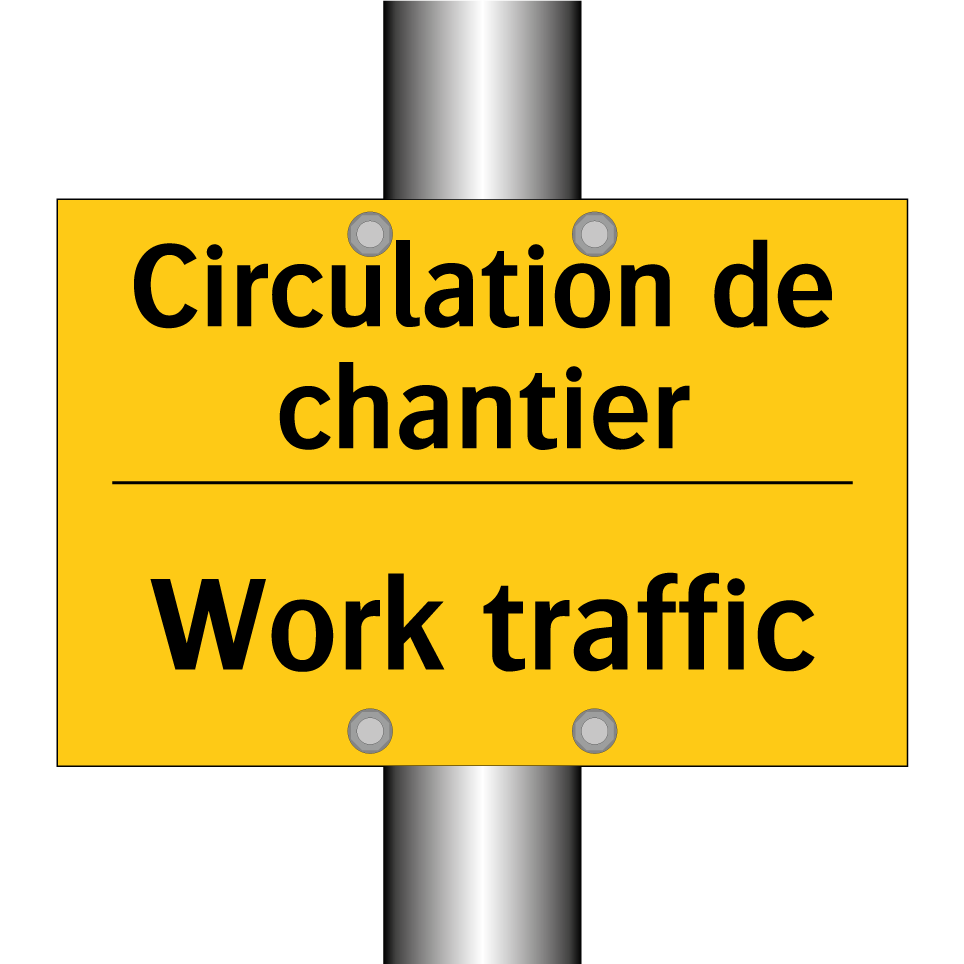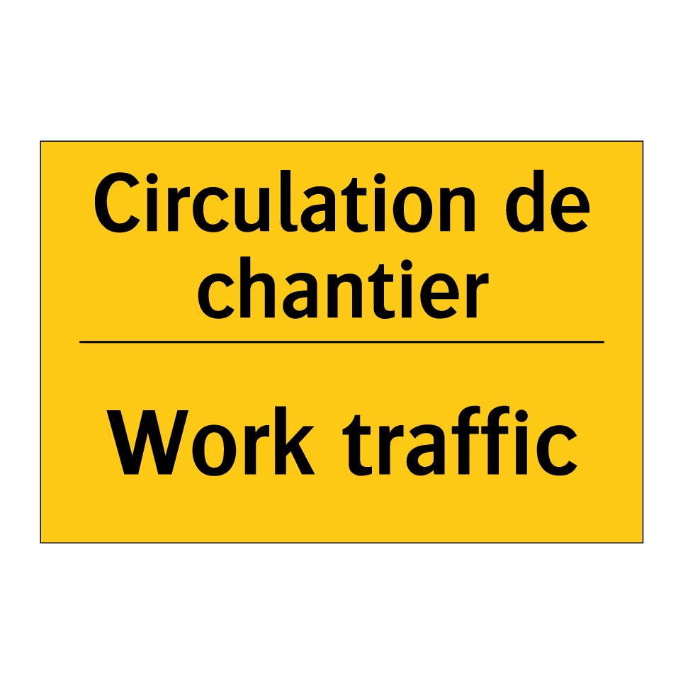 Panneau d'avertissement bilingue avec texte en français : "Circulation de chantier", et en anglais : "Work traffic"
