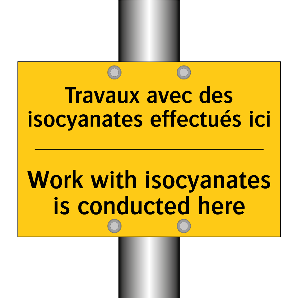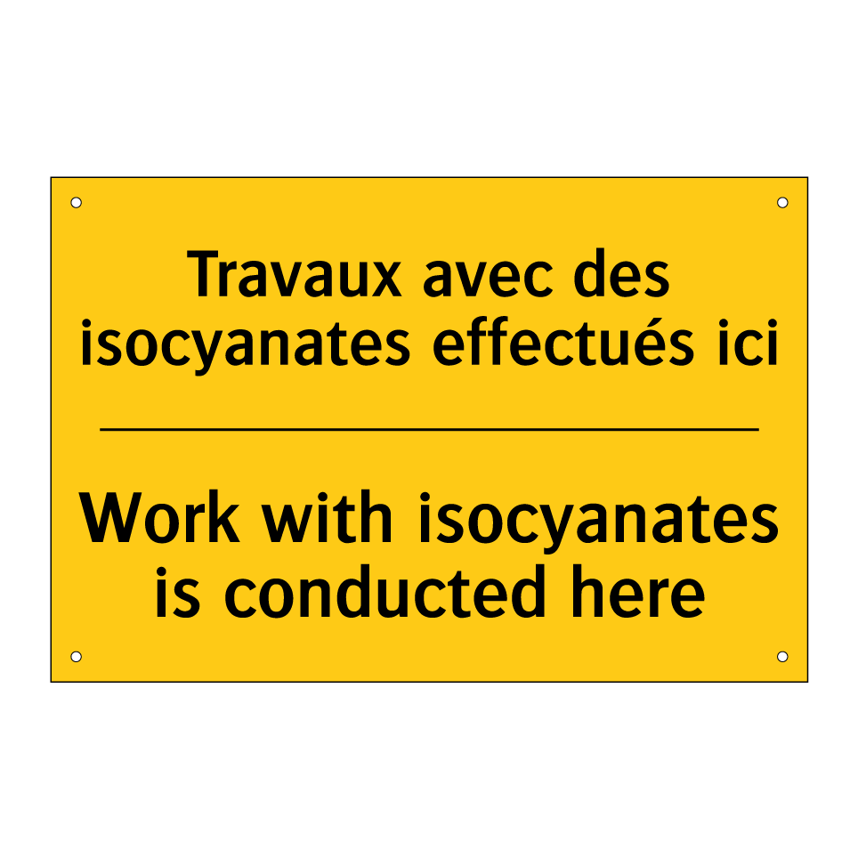 Panneau d'avertissement bilingue avec texte en français : "Travaux avec des isocyanates effectués ici", et en anglais : "Work with isocyanates is conducted here"