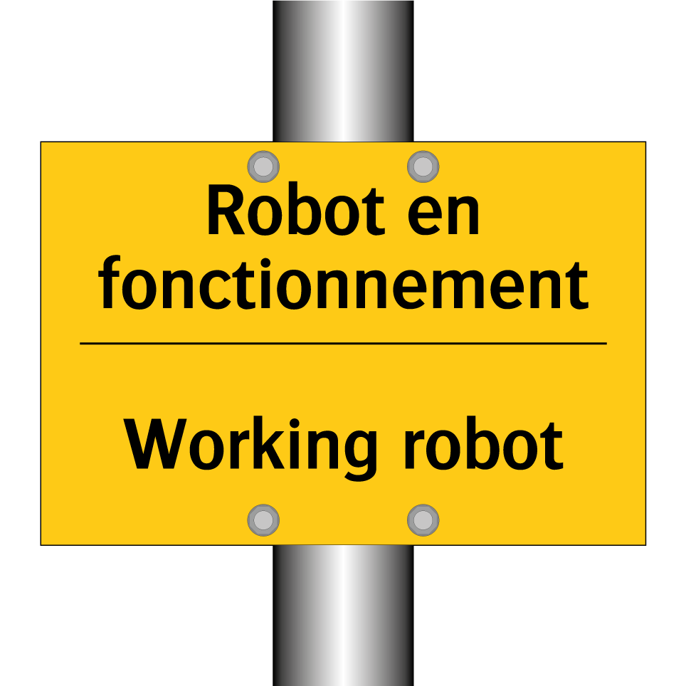 Panneau d'avertissement bilingue avec texte en français : "Robot en fonctionnement", et en anglais : "Working robot"