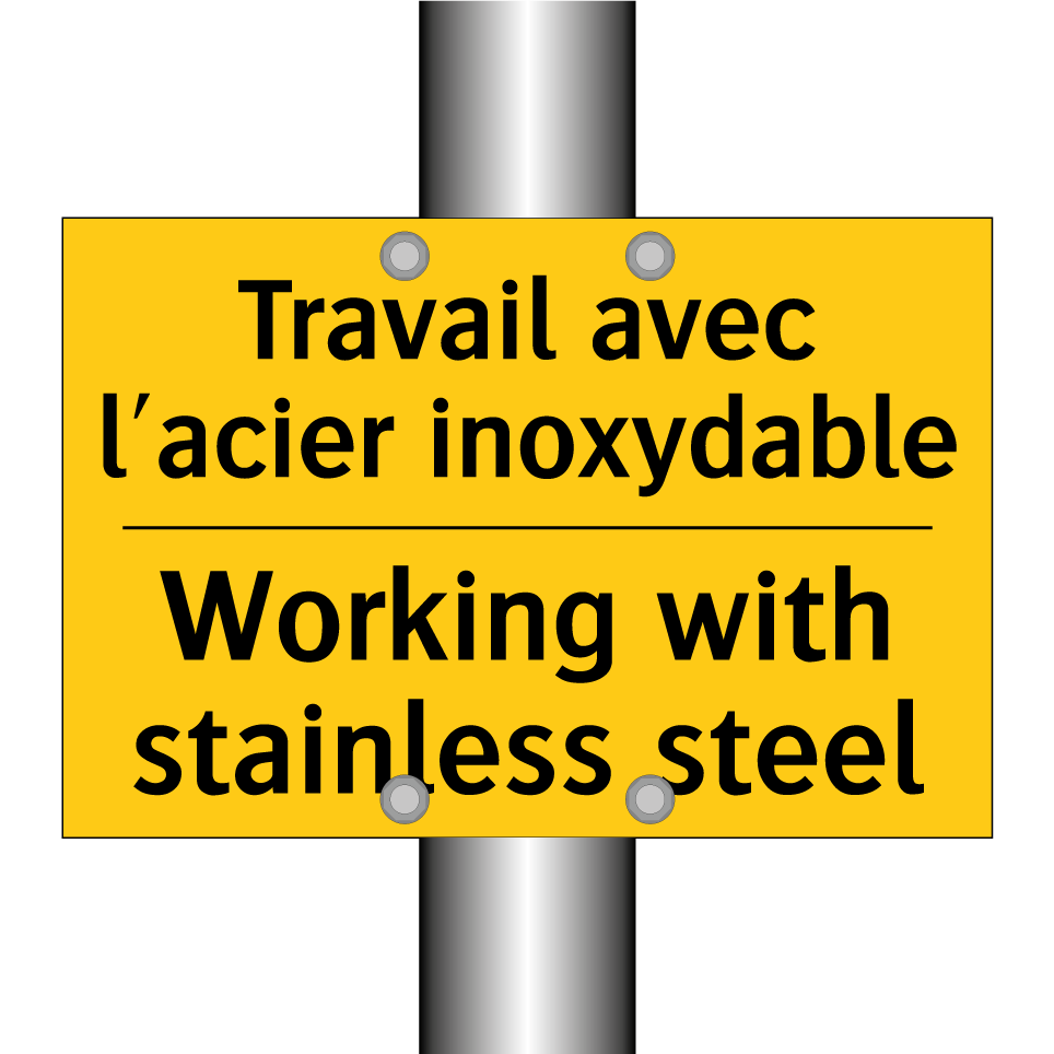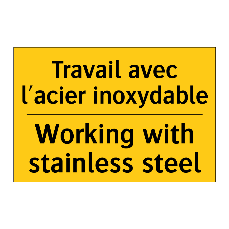 Panneau d'avertissement bilingue avec texte en français : "Travail avec l'acier inoxydable", et en anglais : "Working with stainless steel"