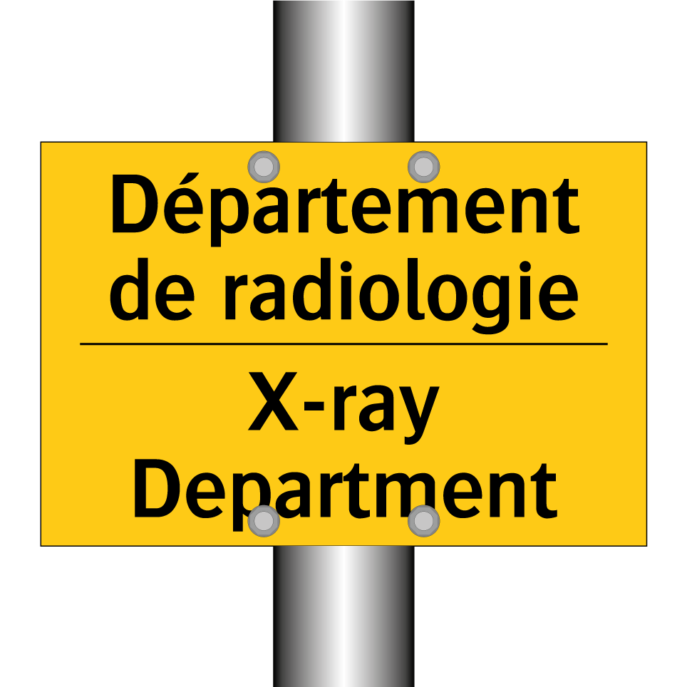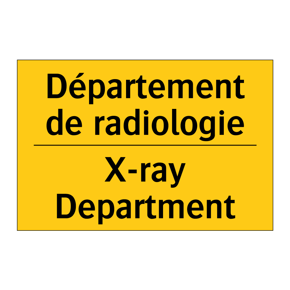 Panneau d'avertissement bilingue avec texte en français : "Département de radiologie", et en anglais : "X-ray Department"