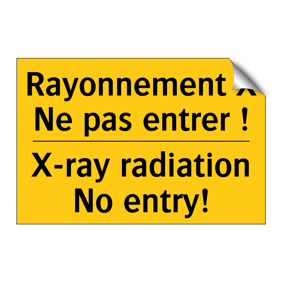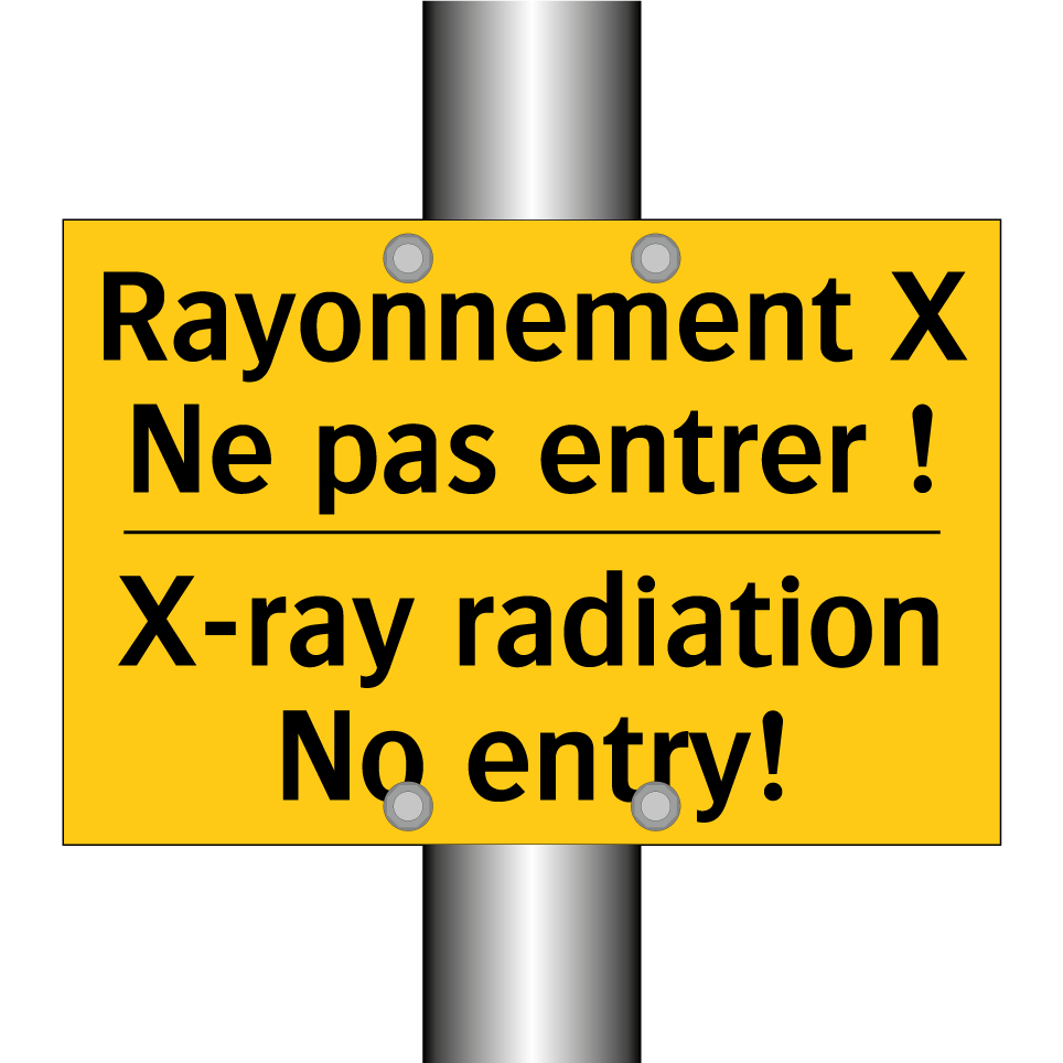 Panneau d'avertissement bilingue avec texte en français : "Rayonnement X Ne pas entrer !", et en anglais : "X-ray radiation No entry!"