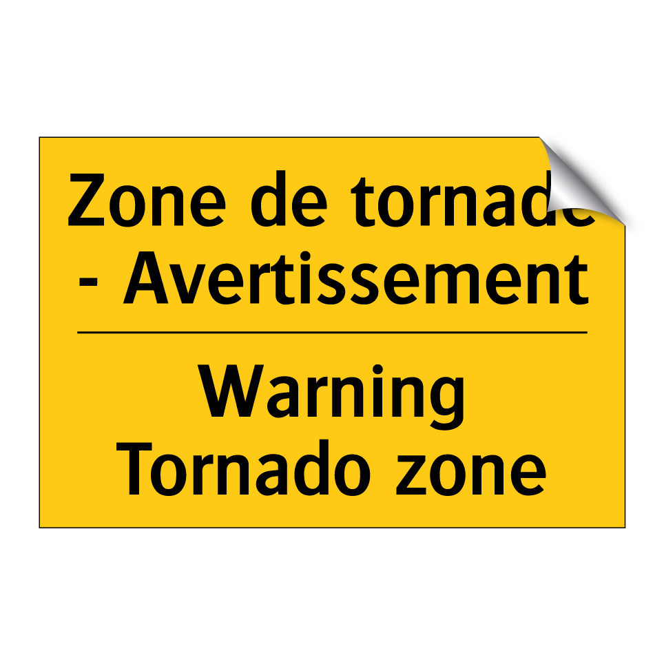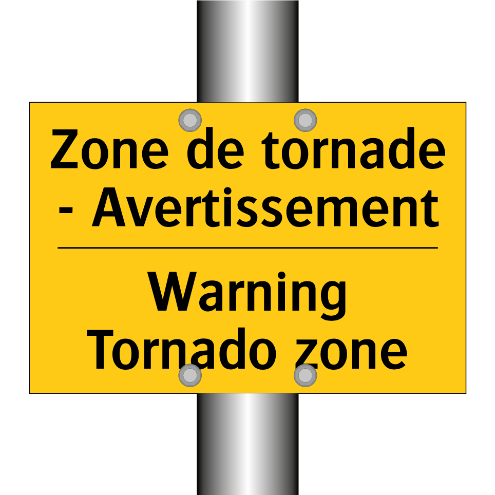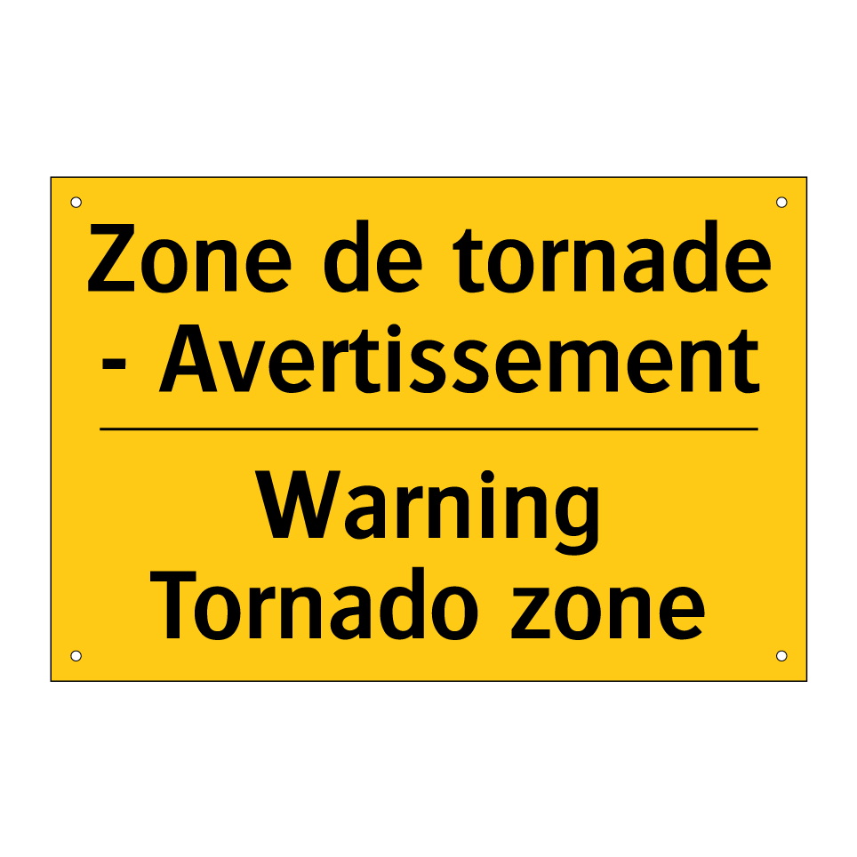 Panneau d'avertissement bilingue avec texte en français : "Zone de tornade - Avertissement", et en anglais : "Warning Tornado zone"