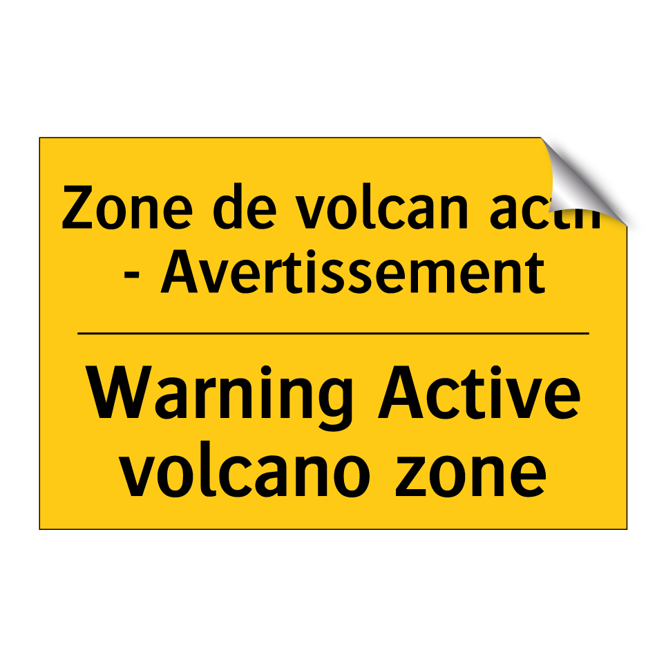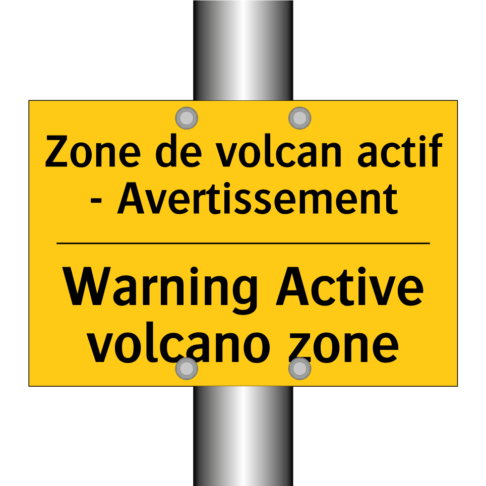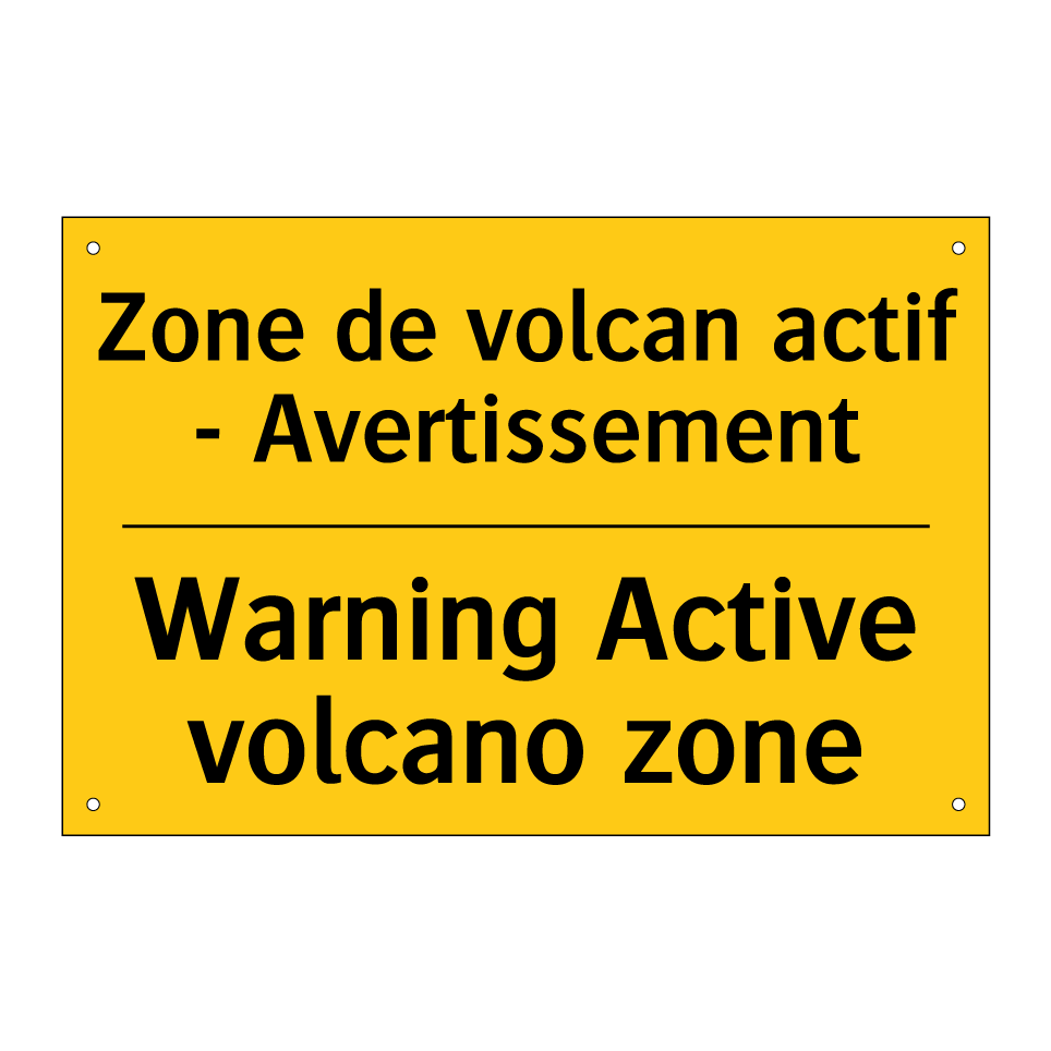 Panneau d'avertissement bilingue avec texte en français : "Zone de volcan actif - Avertissement", et en anglais : "Warning Active volcano zone"