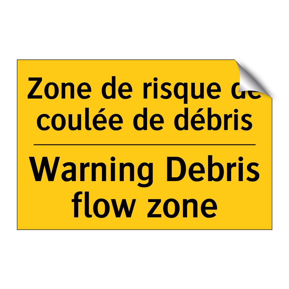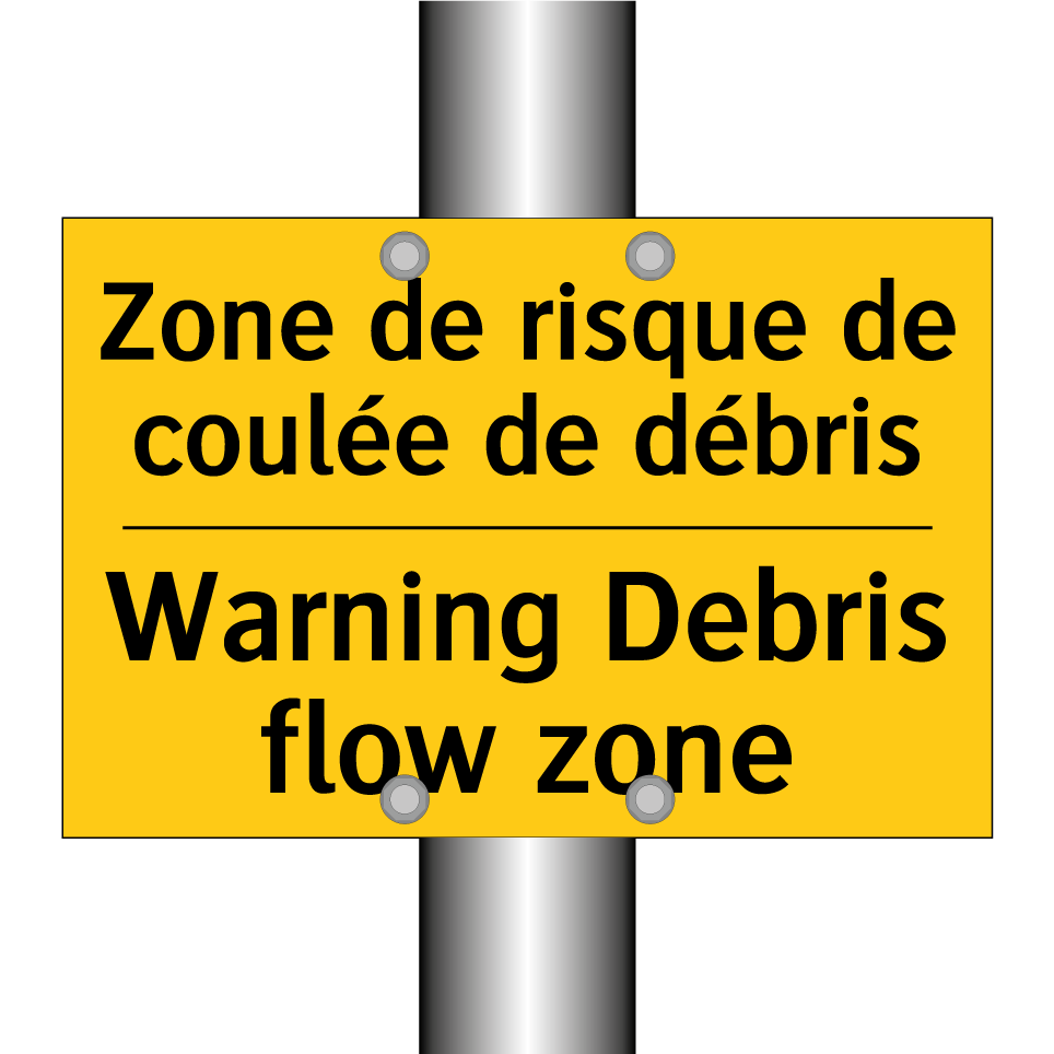 Panneau d'avertissement bilingue avec texte en français : "Zone de risque de coulée de débris", et en anglais : "Warning Debris flow zone"
