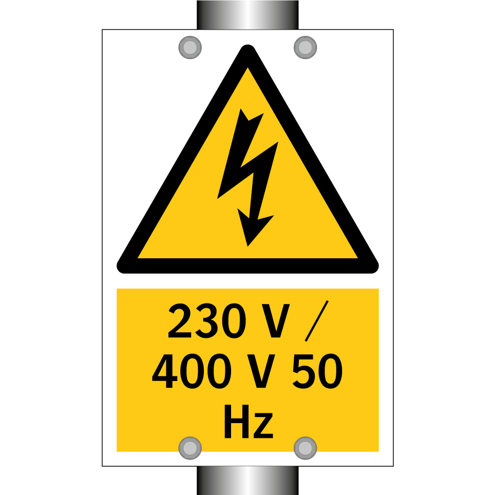 Panneau d'avertissement avec le texte : "230 V / 400 V 50 Hz"