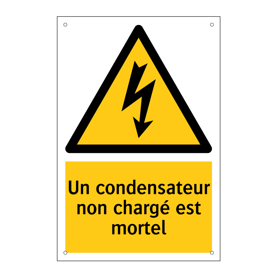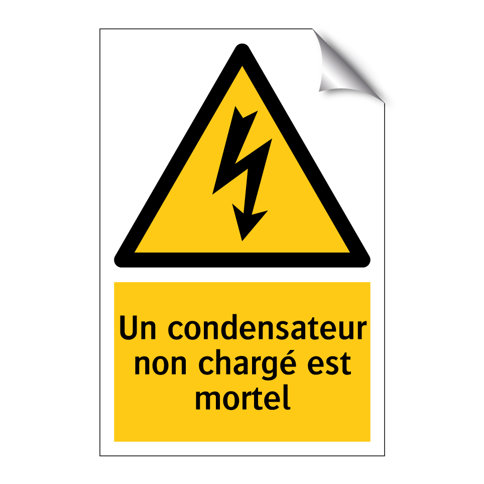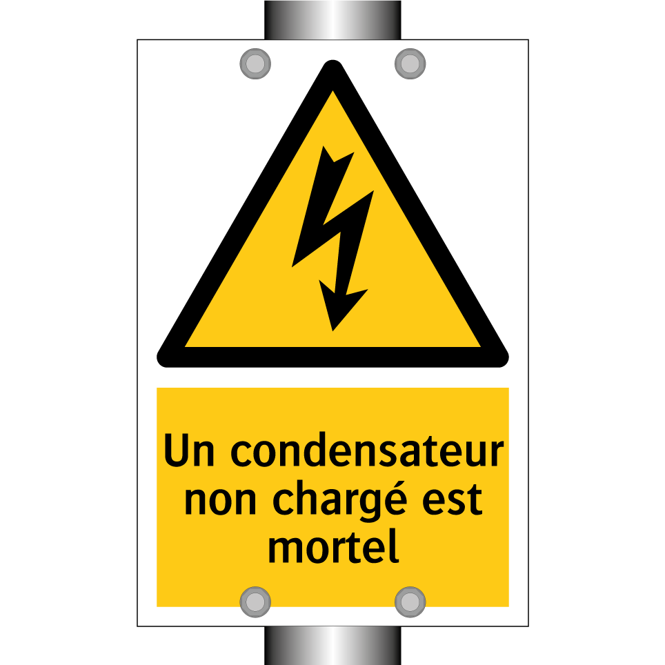 Panneau d'avertissement avec le texte : "Un condensateur non chargé est mortel"