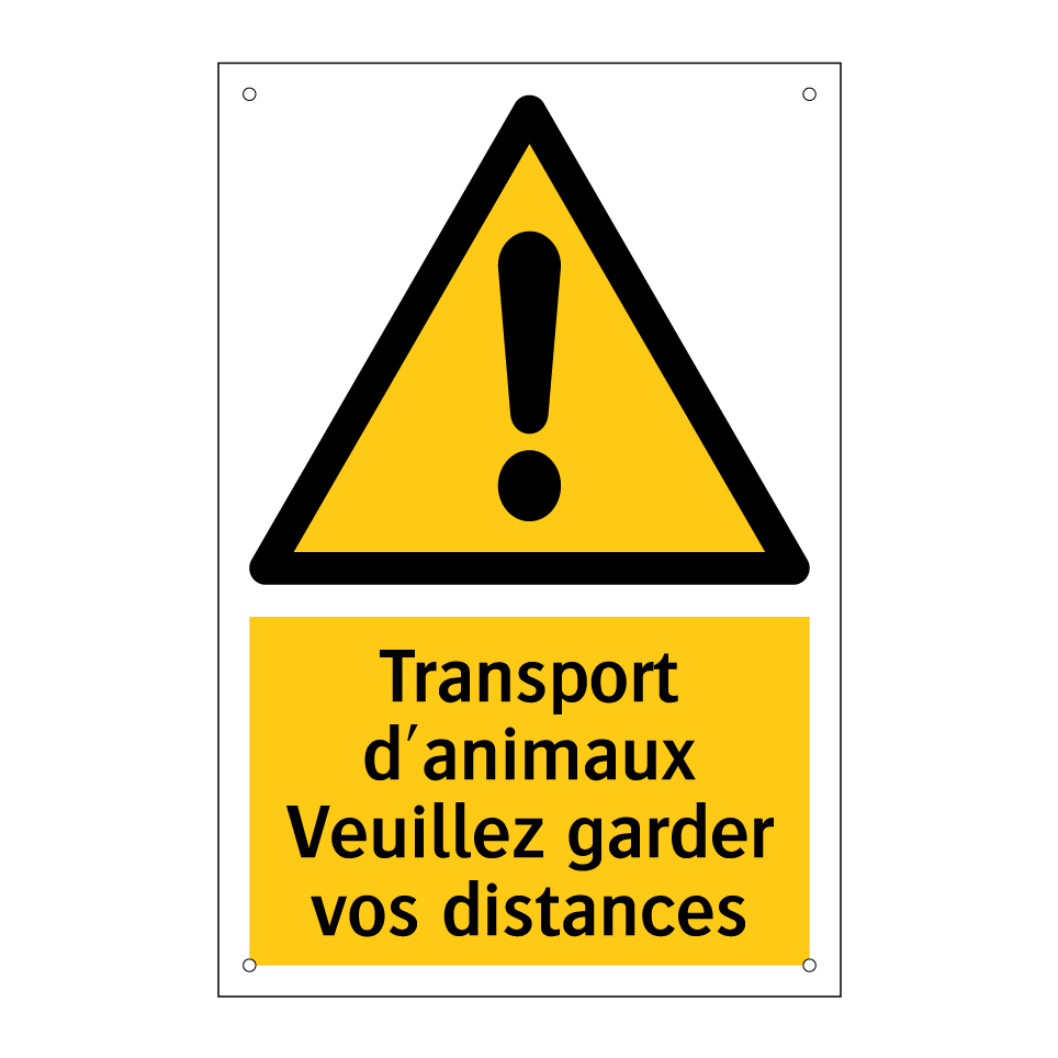 Panneau d'avertissement avec le texte : "Transport d'animaux Veuillez garder vos distances"