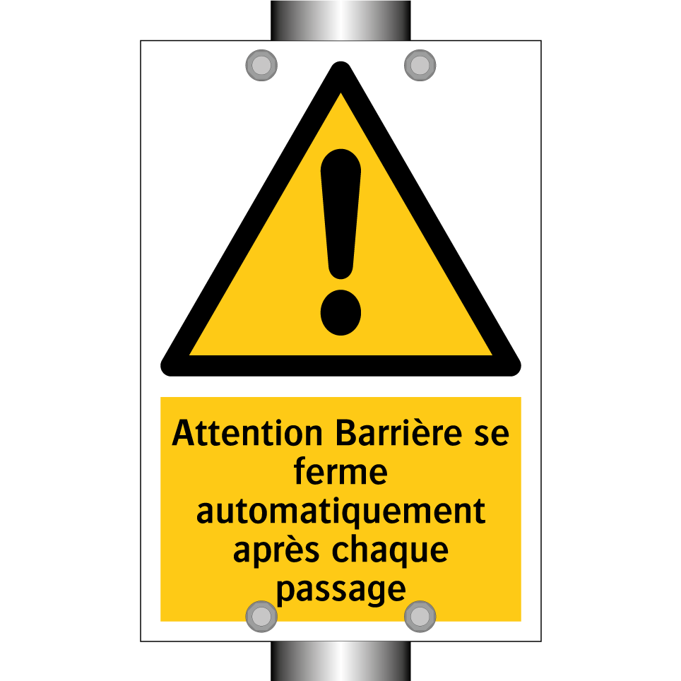 Panneau d'avertissement avec le texte : "Attention Barrière se ferme automatiquement après chaque passage"