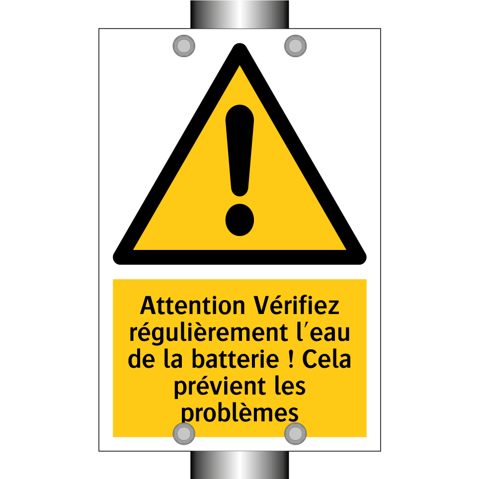 Panneau d'avertissement avec le texte : "Attention Vérifiez régulièrement l'eau de la batterie ! Cela prévient les problèmes"