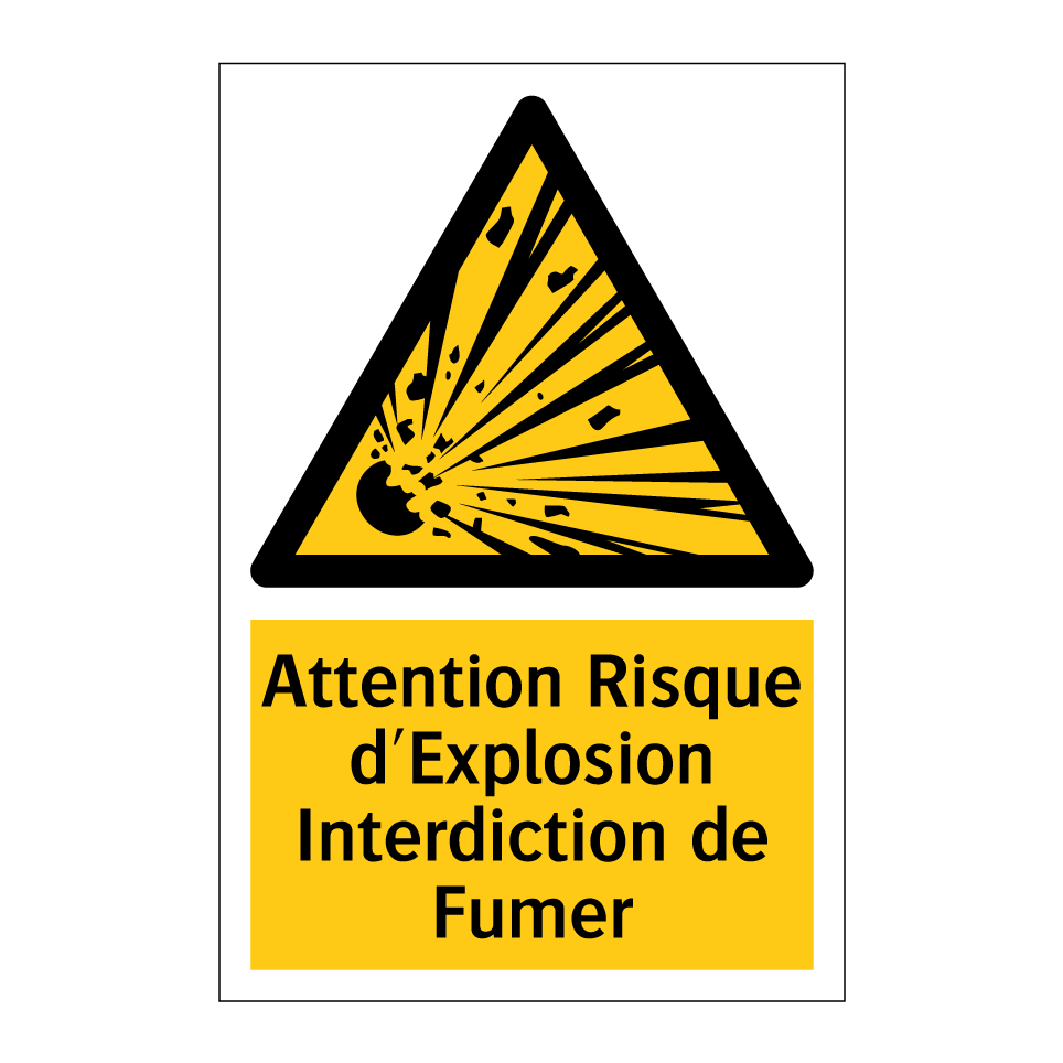 Panneau d'avertissement avec le texte : "Attention Risque d'Explosion Interdiction de Fumer"