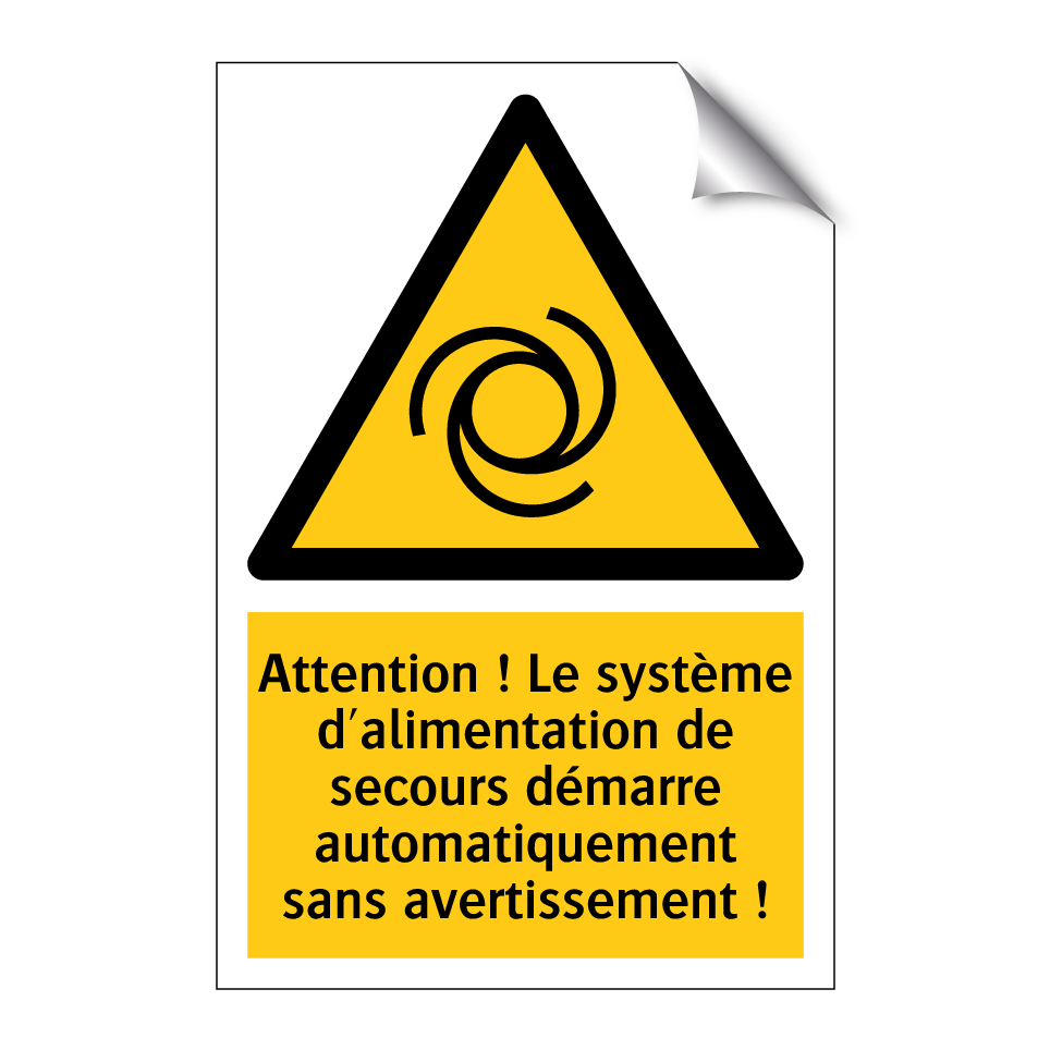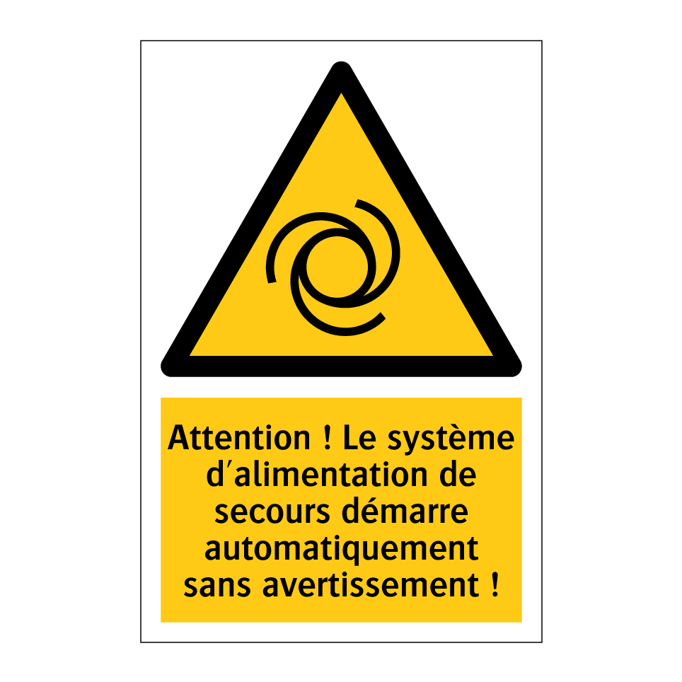 Panneau d'avertissement avec le texte : "Attention ! Le système d'alimentation de secours démarre automatiquement sans avertissement !"