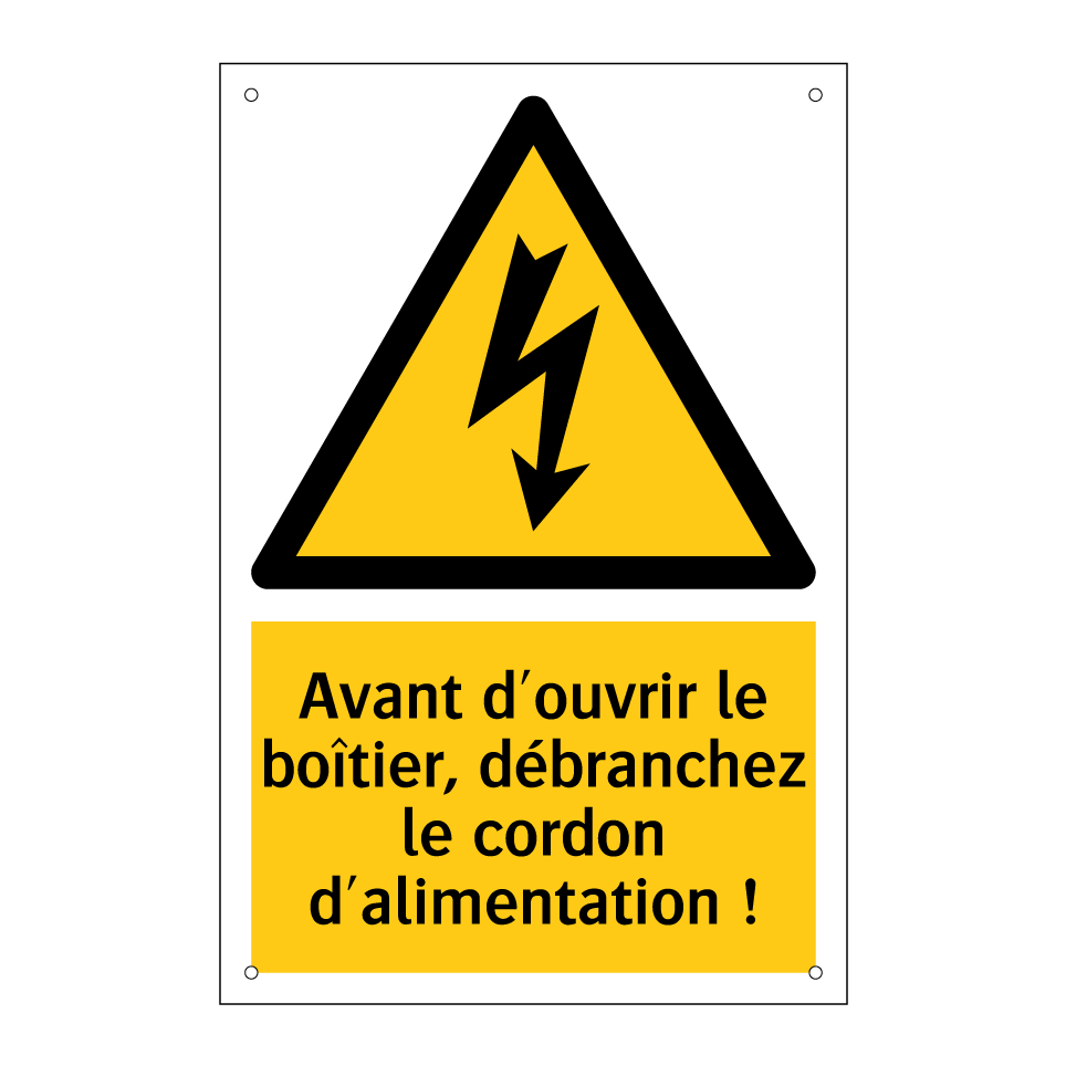 Panneau d'avertissement avec le texte : "Avant d'ouvrir le boîtier, débranchez le cordon d'alimentation !"