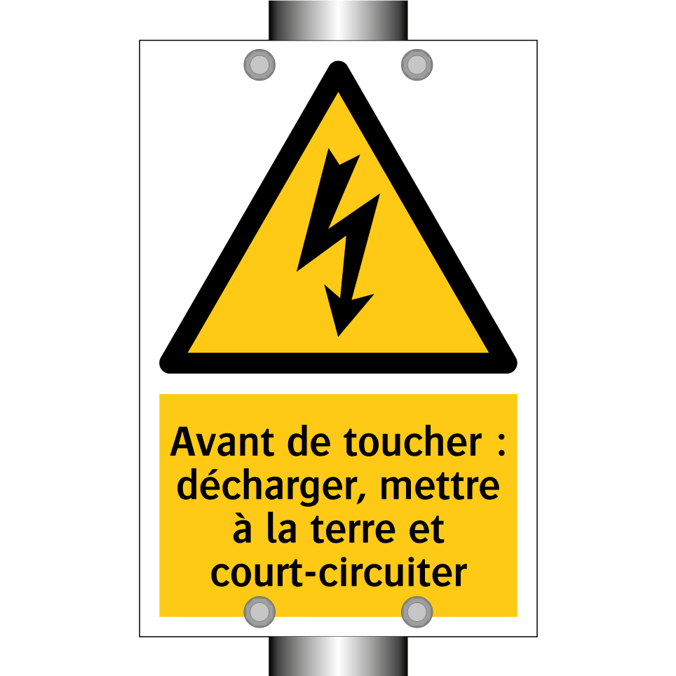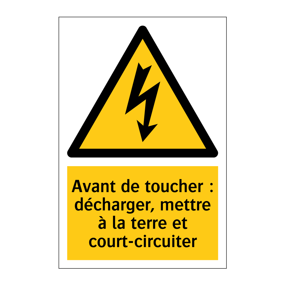 Panneau d'avertissement avec le texte : "Avant de toucher : décharger, mettre à la terre et court-circuiter"