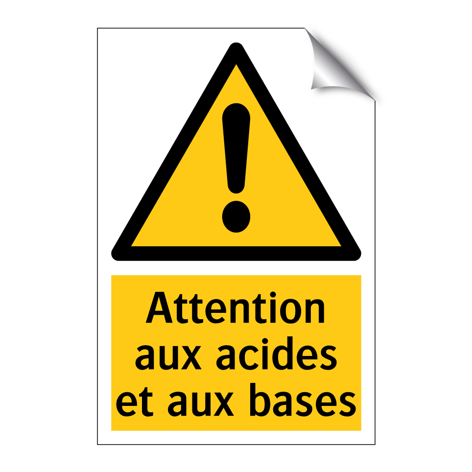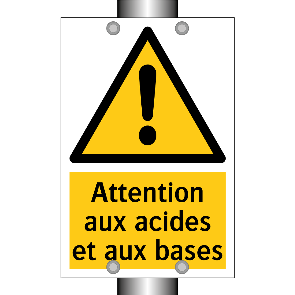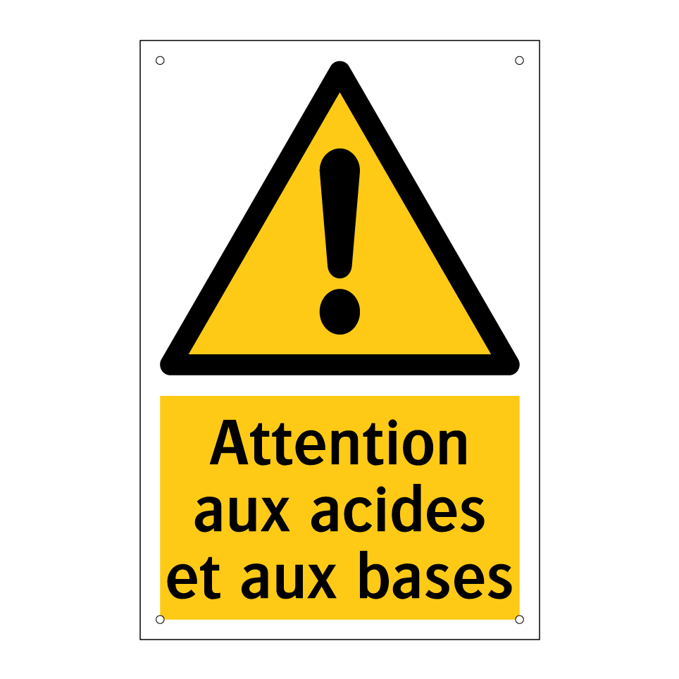 Panneau d'avertissement avec le texte : "Attention aux acides et aux bases"
